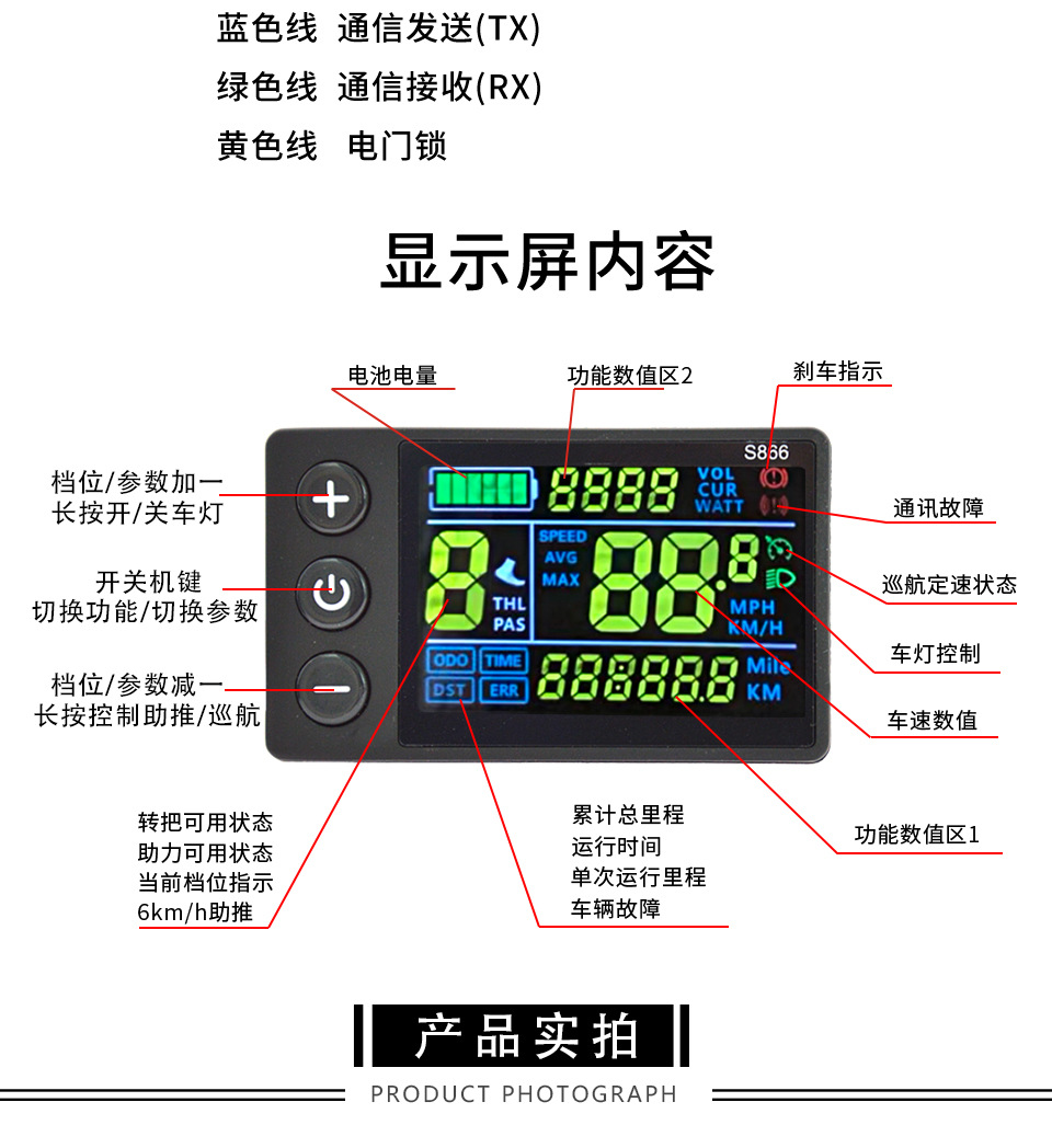 S866 цветной экран, шестипроводной электрический велосипед, горный велосипед, LCD мопед, умный LCD дисплей