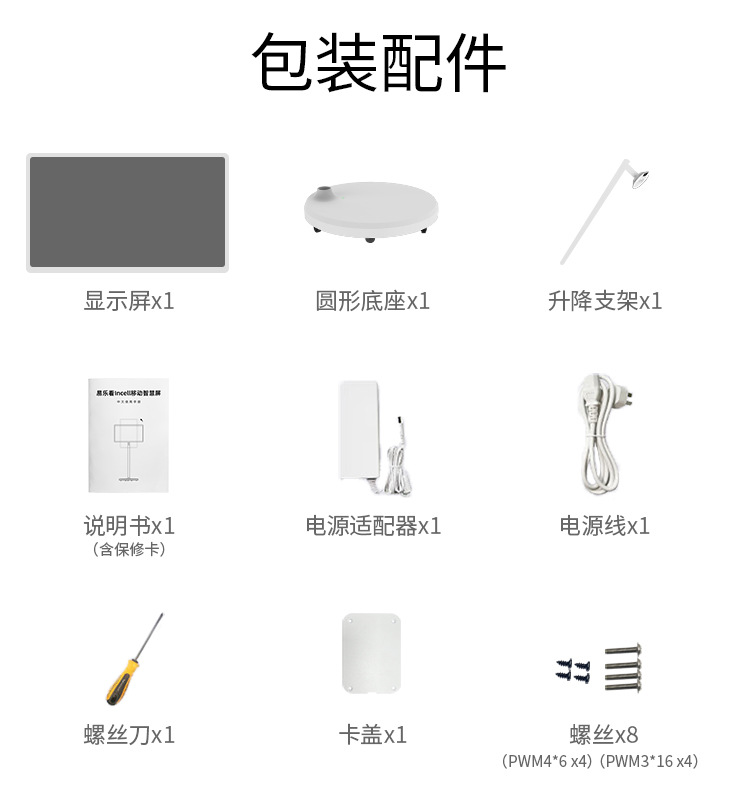 Список упаковки Advertising machine x1, power adapter x1, data cable x1, manual x1, high-brightness personalized protective film (already pasted before shipment) x1, qualified