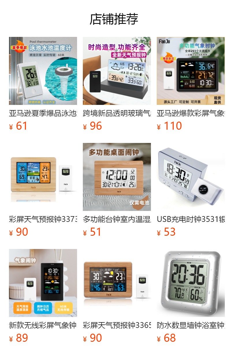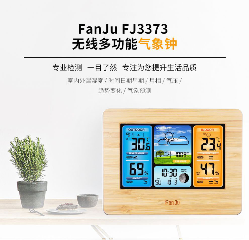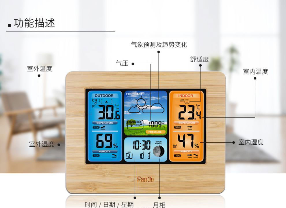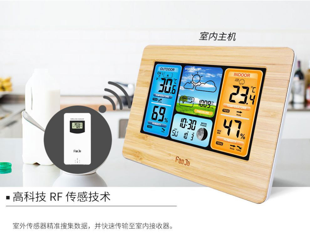 (5)常规包装清单:1*气象钟,1*USB电源线,1*传感器,1*英文说明书。