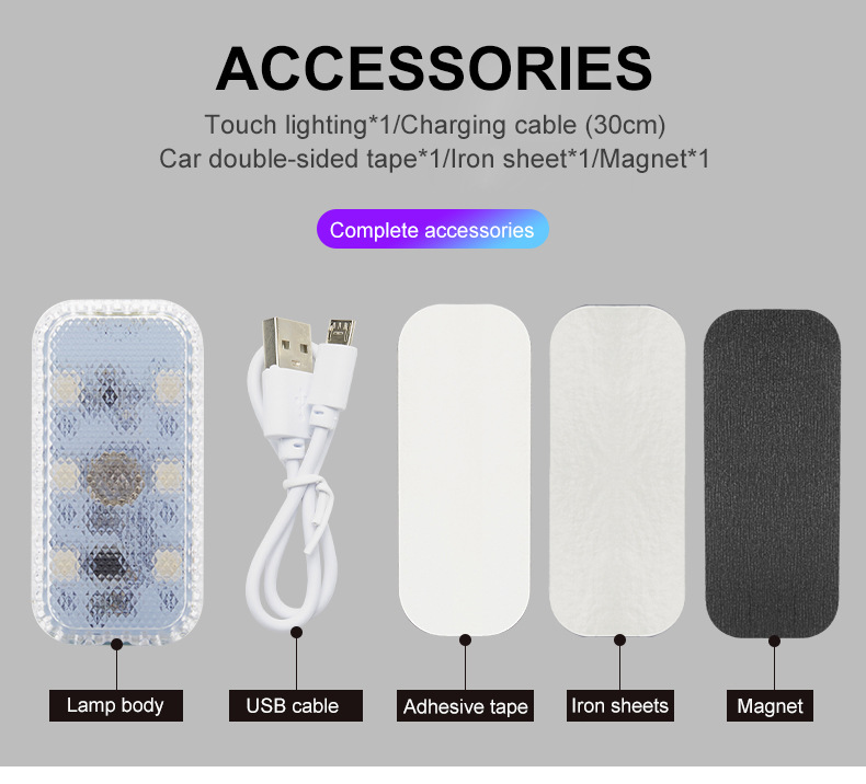1. USB charging car LED touch light, car mini car reading light; auxiliary lighting adds to the atmosphere. Small and exquisite, it lights up at the touch of a touch, and the lights are bright.