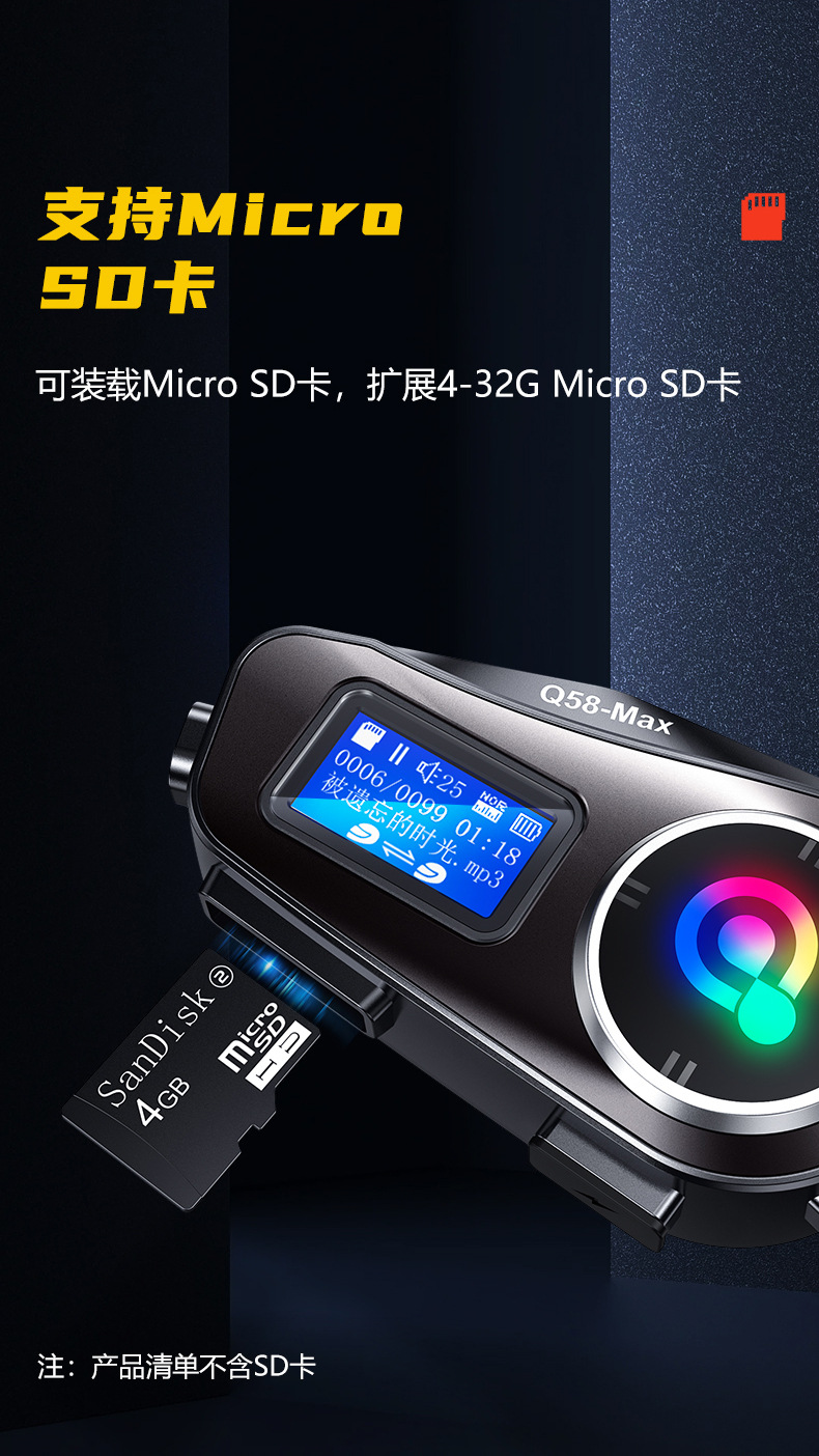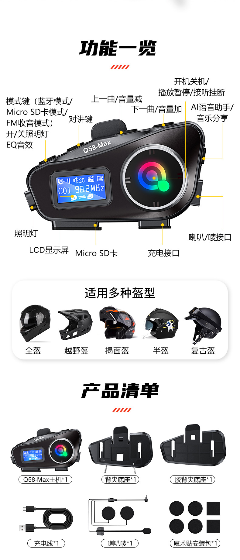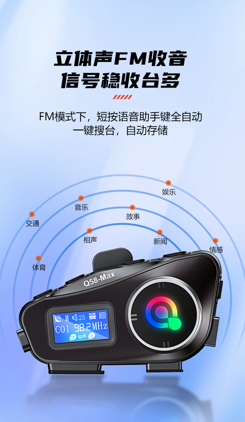 Bluetooth гарнитура Q58MAX, TF карта, MP3, смешивание музыки, FM, водонепроницаемая гарнитура для шлема
