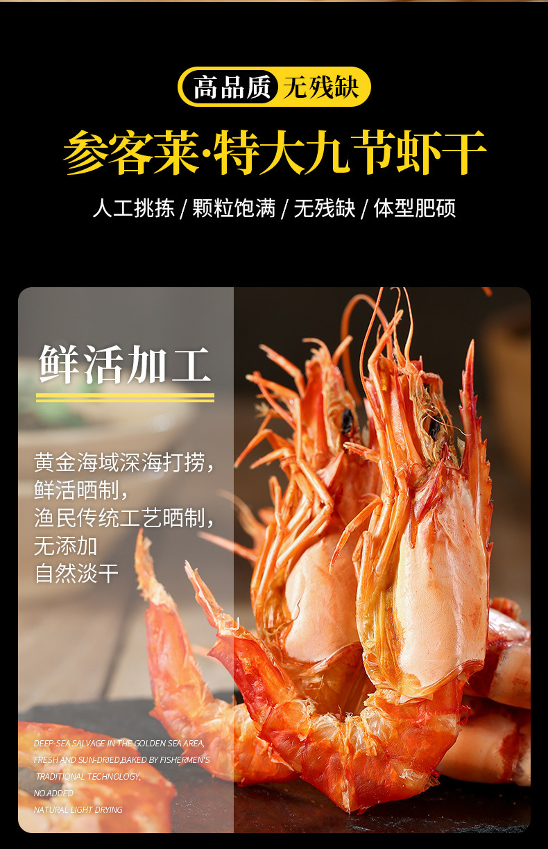 ![]() | 250g*1 pack [about 30-35 pieces/pack] extra large dried nine-segment shrimp | ¥49.0 / ≈ 596 ₽ | 88882 | 6096785023999 | |