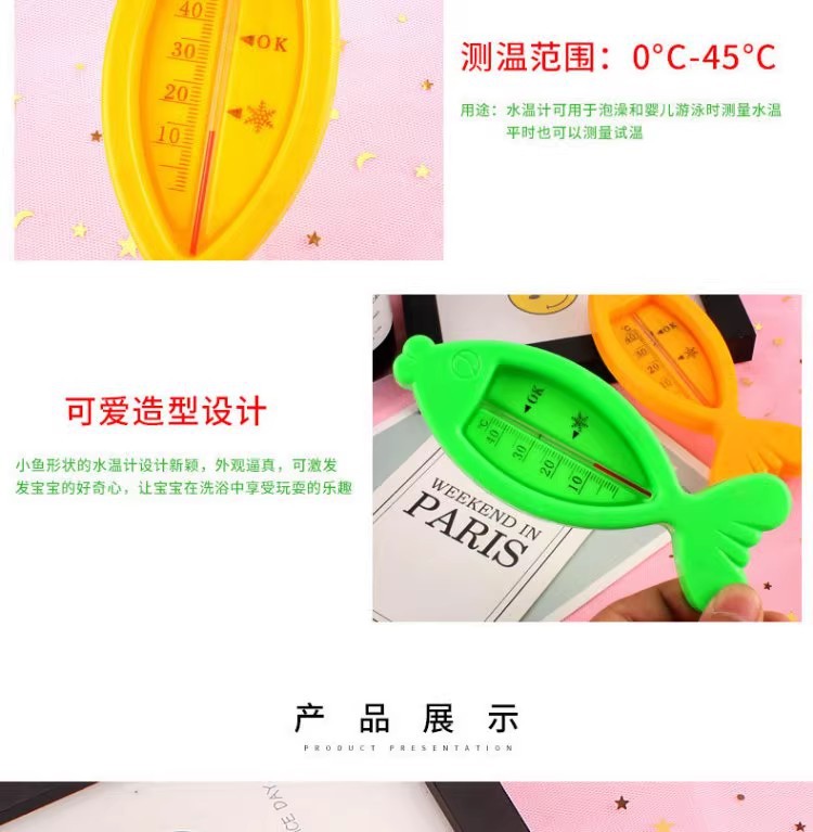 特点:小鱼形状的水温计设计新颖,外观逼真,可激发宝宝的好奇心,让宝宝在洗浴中享受玩耍的乐趣。