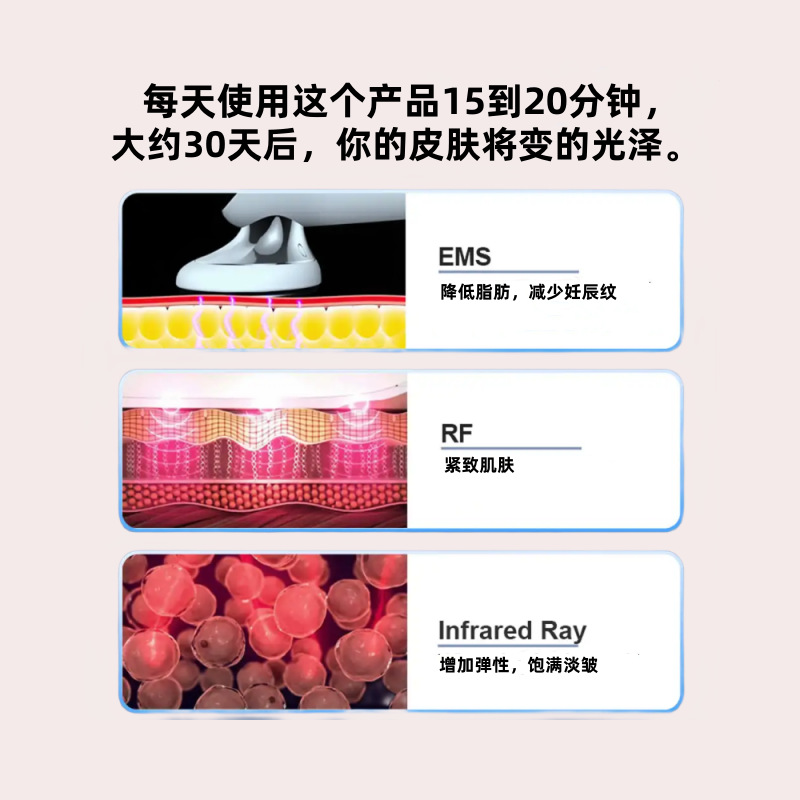 (1)EMS微电流:EMS产生的微电流波刺激肌肉,收紧肌肉,刺激胶原蛋白更新,让您看起来更年轻。