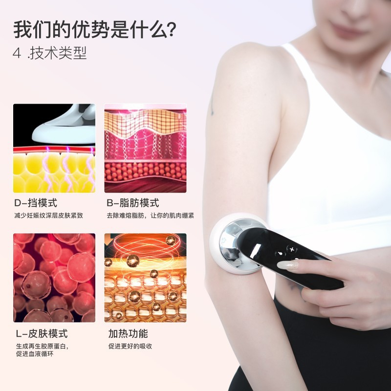 (2)射频:无线电波穿透真皮层,将电能转化为热量,帮助燃烧脂肪,紧致皮肤,再生胶原蛋