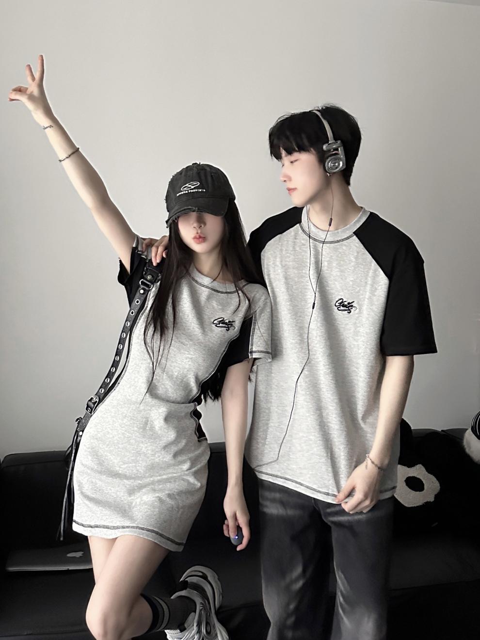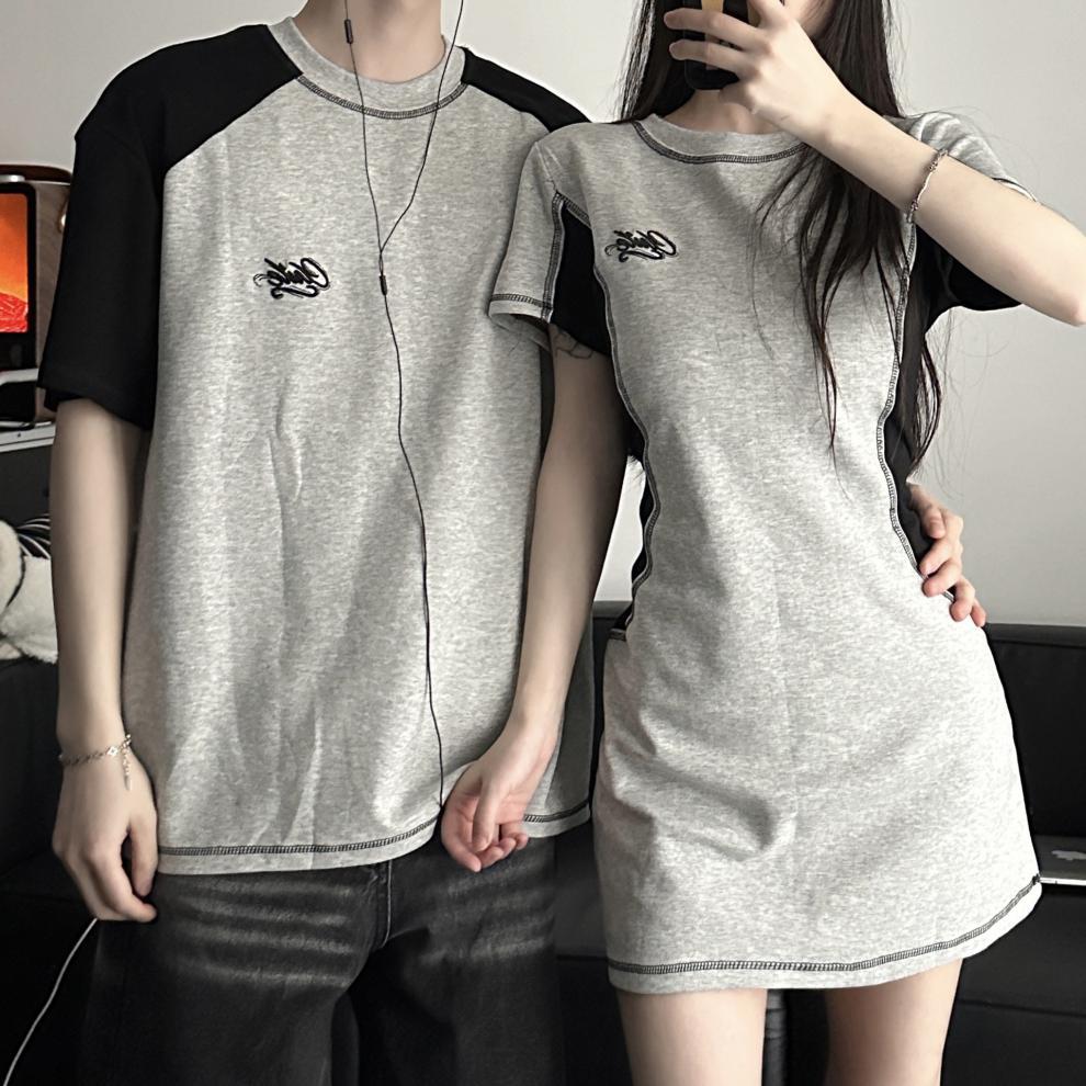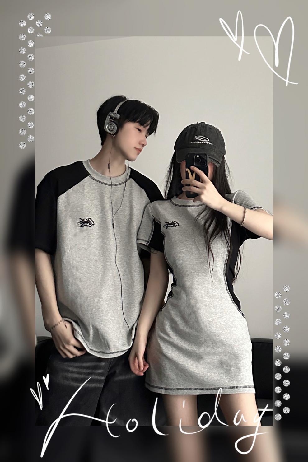 Летнее американское спортивное платье с коротким рукавом, 2024, высокая талия, стройный A-образный силуэт, футболка для пар