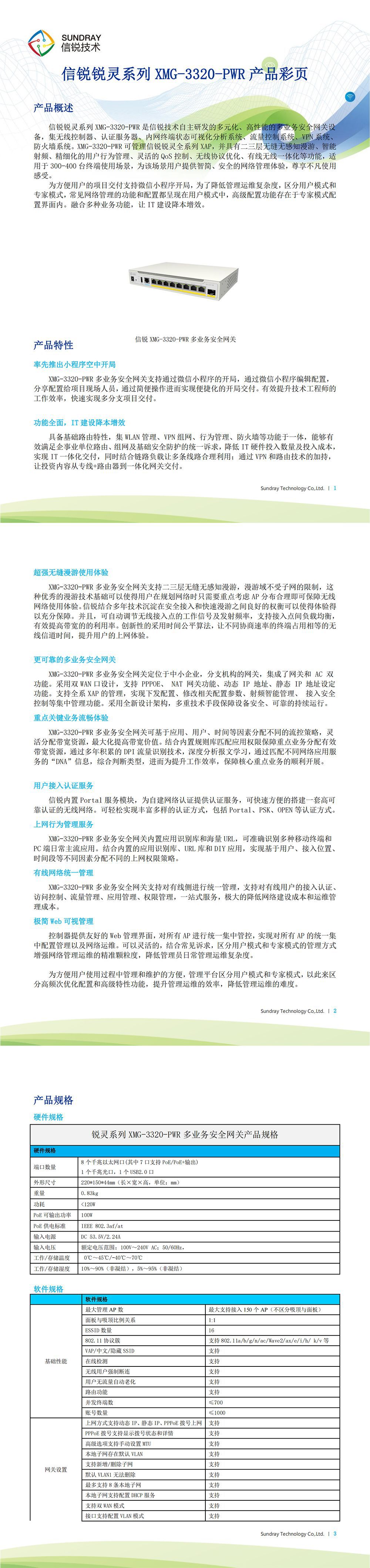 XMG-3320-PWR 信锐锐灵系列一体化路由器,8个千兆以太网口,1个千兆光口,其中7口支持PoE+/PoE,整机PoE最大供电总功率100W,最大支持150个AP(不区分吸顶与面板),最大并发700终端,整机含DC直流电源。支持统一身份认证、应用层流控、VPN、支持管理AP、集群管理、可视化网管。