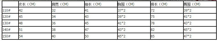 | 衣长(CM) | 肩宽(CM) | 袖长(CM) | 胸围(CM) | 裤长(CM) | 臀围(CM) | |