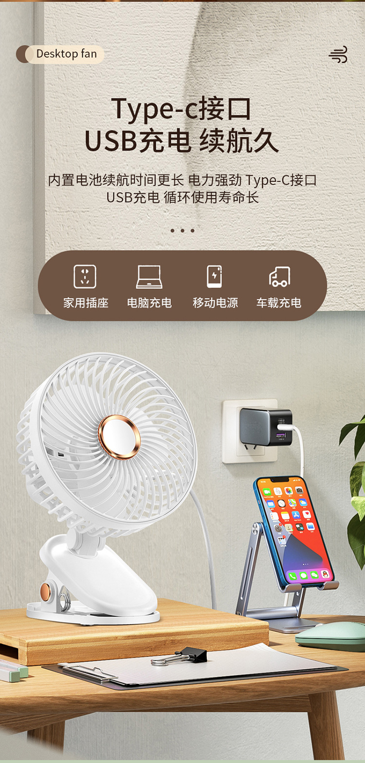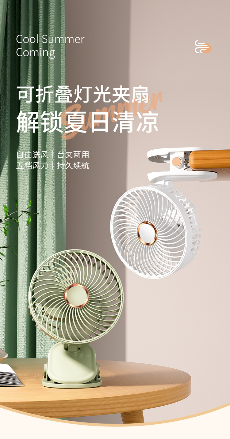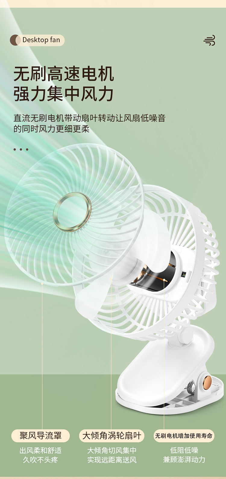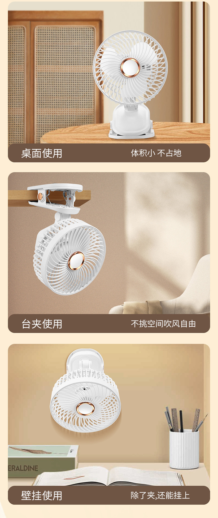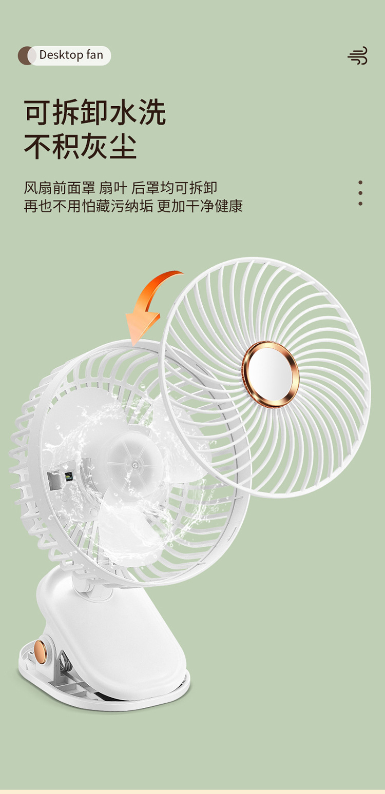 Характеристики продукта Five-speed wind adjustment, foldable and easy to store, can be placed on the desktop, can be clamped and hung on the wall, stepless dimming, brushless motor, can change the angle up and down, left and right at any time