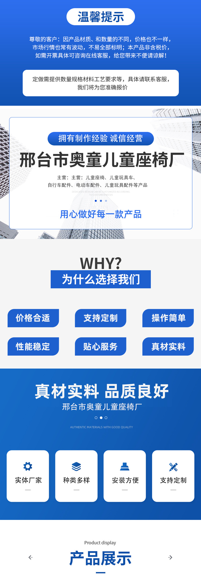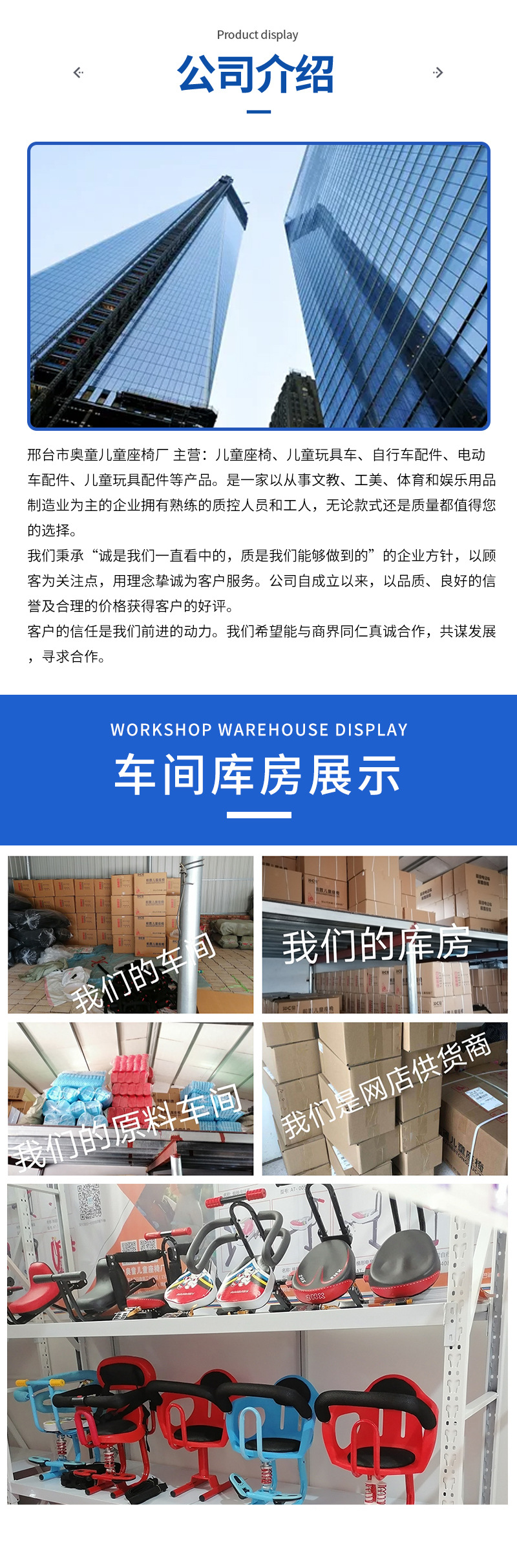 本厂专业生产儿童宝宝前后排座椅,各种电动车、踏板车、电摩、自行车、山地车等车小孩座子,坐凳等产品十多年,有经验丰富的技师团队,和精心设记生产及产品出库检验等细节,每个细节每道工序都严格遵循为宝宝的安全出行而保驾护航,为宝宝的快乐健康成长为原则。童车玩具及配件为一体,现结合生产销售一条龙模式。支持定做,支持混批,可来样定做,现货当天发,欢迎新老顾客光临选择。