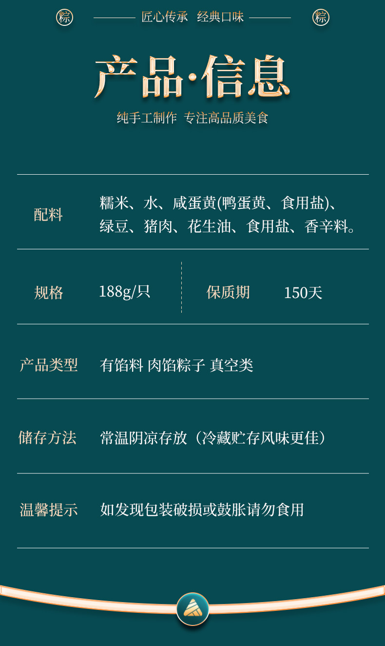 Сырьё и ингредиенты Glutinous rice, water, salted egg yolk (duck egg yolk, edible salt), mung bean, pork, peanut oil, edible salt, white granulated sugar, fragrant material.