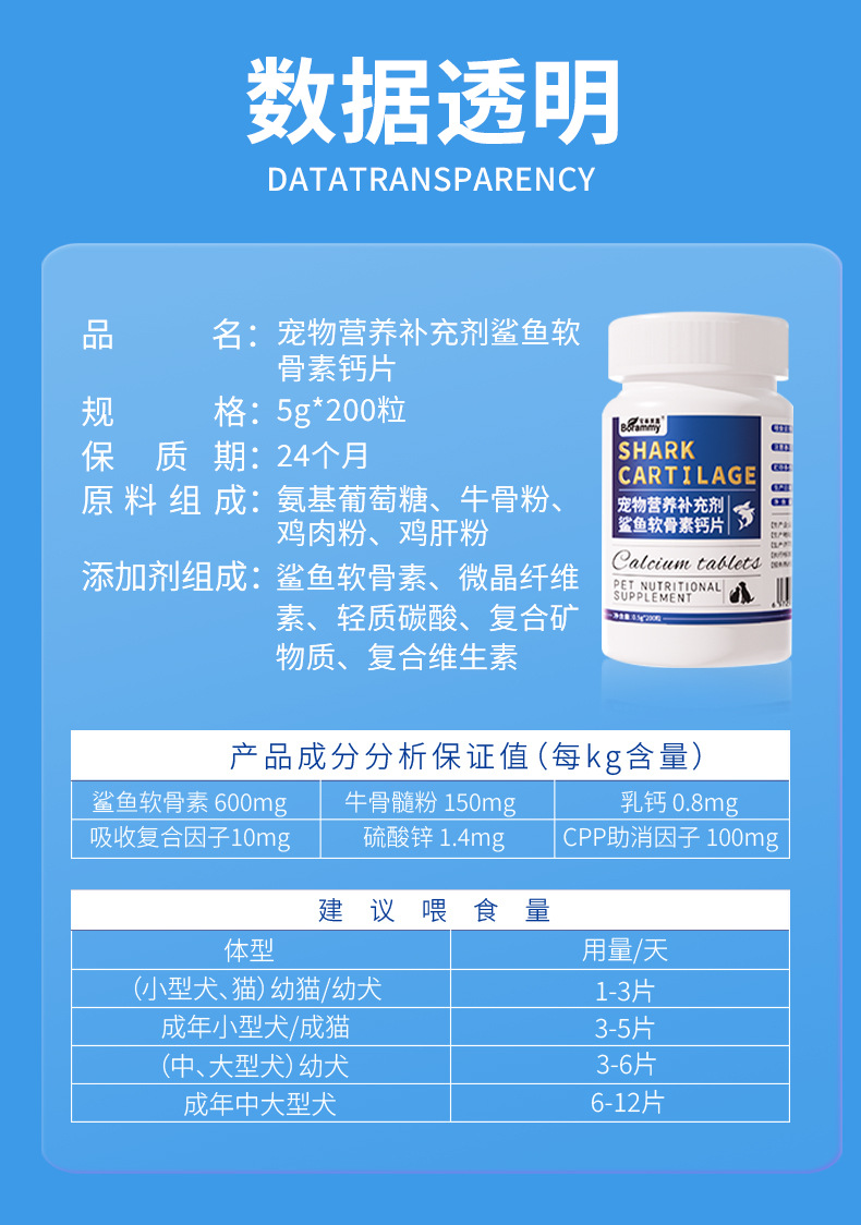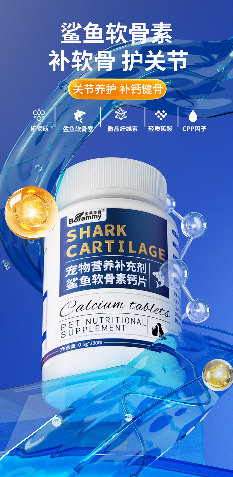 Таблетки кальция Baolai Meilu из акульего хряща, 200 таблеток для собак и кошек, нейтральный уход за хрящами, укрепление костей