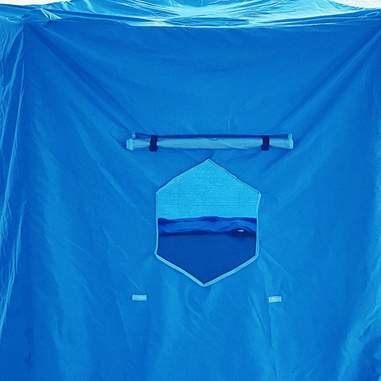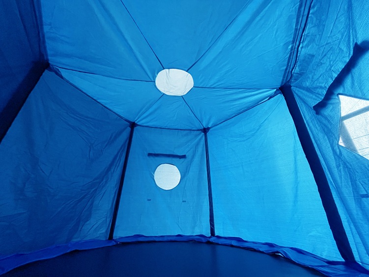 帐篷共有4个窗户,顶部1个,四周3个,门口有拉链。