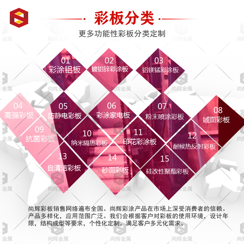 尚辉(天津)金属材料有限公司志在打造专业化的钢材超市,现货+生产的销售模式。现货主要经营唐钢、首钢、邯钢、酒钢、宝钢等各大厂的镀铝锌卷板,冷轧卷板,镀锌卷板,冷轧卷板,彩涂卷板等产品。并与厂家建立长期合作关系。自备大型室内仓储设备,产品库存量大,规格齐全,满足客户的不同需求。专业化的加工设备,客户可根据需要选择开平、分条、覆膜等服务。加工精密度高,方便,快捷,减少运输成本。专业的物流团队,送货及时,快速方便,送货到指定地点。我公司的生产的镀锌带钢,冷轧带钢,波纹管带钢等系列产品远销国内外一致受到好评。