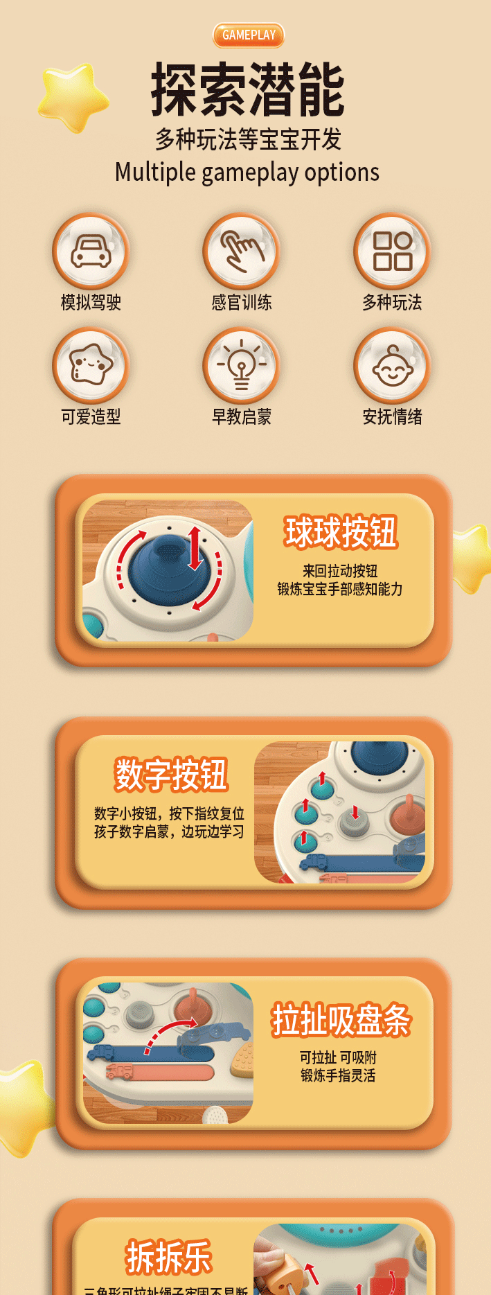 Развитие способностей Emotional, Visual, Intellectual development, Crawling, Use your hands and brain, Grasping, Sensory, Hand-eye coordination, Other ability development, Interactive toys, Hearing, Parent-child communication, Interest cultivation