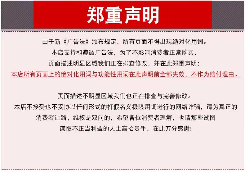 6、关于物流:卖家有义务为您安排合适物流发货,我们能保证发货时间,但是由于物流受天气,政策,人为等因素影响故不能保证具体到货时间,仅提 供大概到货时间供客户参考,物流运输进度可随时联系客服为您查询,具体到货时间以物流通知为准。物流延误,到货时间慢等原因不作为退换货的 理由,敬请谅解