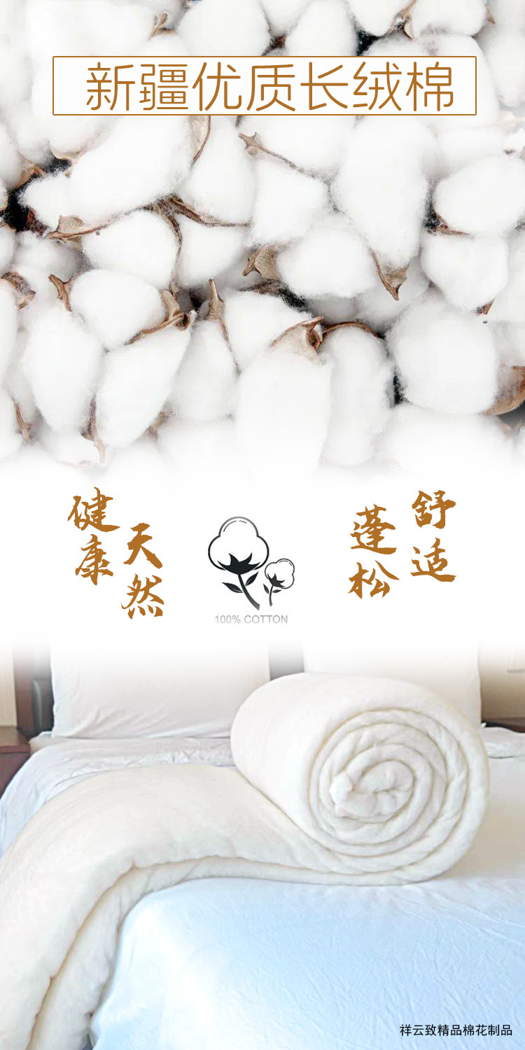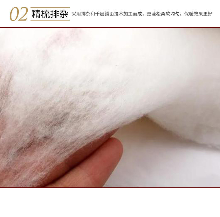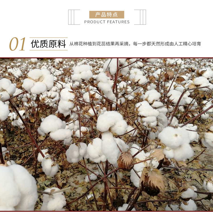 产品介绍:本产品为一级新疆长绒棉,生产过程使用18道工艺,并经过160°高温杀毒,具有轻盈、蓬松、透气的特点;是宝妈的不二选择,适合用到各种宝宝的衣物和棉被中,也可以填充到各种毛绒玩具、枕芯、沙发、靠垫中。本品为天然纯植物纤维,对人工合成的纤维有过敏性的人群尤其可以使用。
