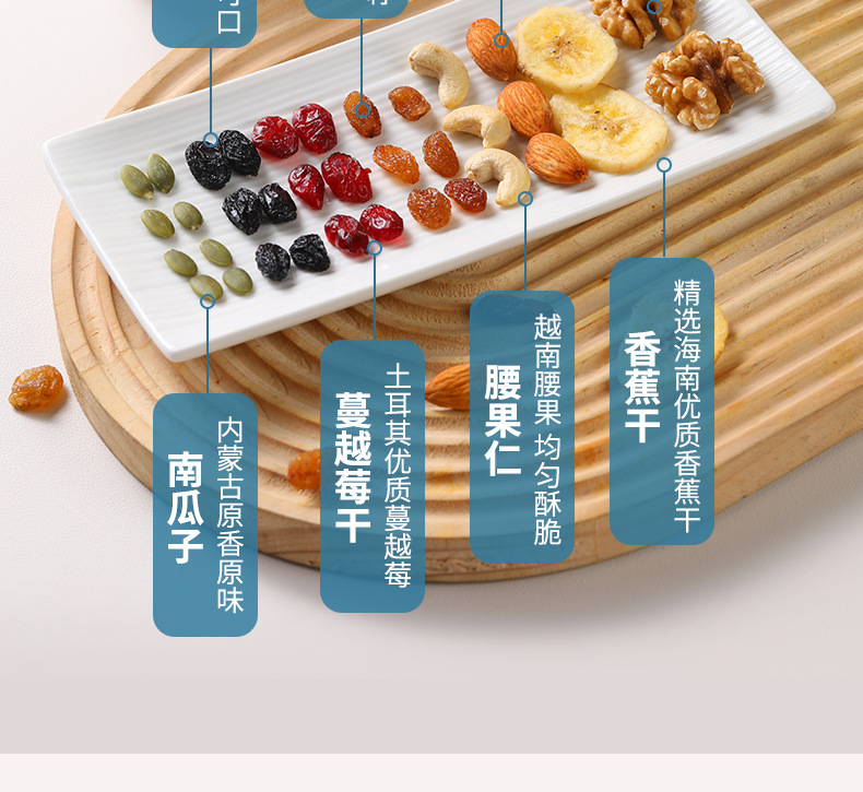 Сырьё и ингредиенты Raisins, walnuts, almonds, dried bananas, cashews, pumpkin seeds, black currants, dried cranberries