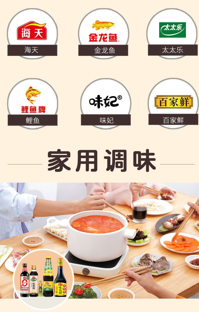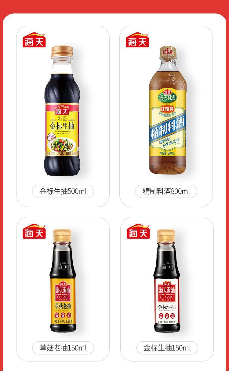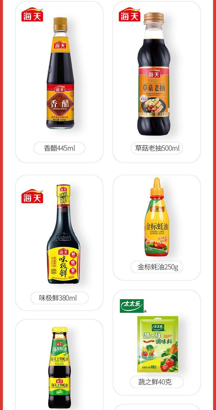 ![]() | Light soy sauce, cooking wine, oyster sauce, vinegar, chicken essence, salt | ¥15.9 / ≈ 193 ₽ | 454 | 5926526053099 | |
