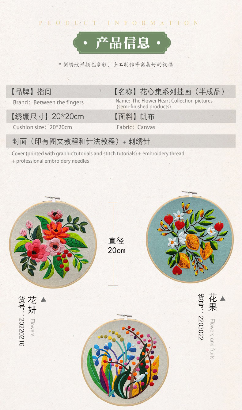 ![]() | 4 combination sets (flower green + flower fruit + flower center + flower dance) + pink scissors + flower-shaped needle threader | Bring a 20cm bamboo embroidery stretcher | ¥31.9 / ≈ 385 ₽ | 0 | 6038285022147 | |