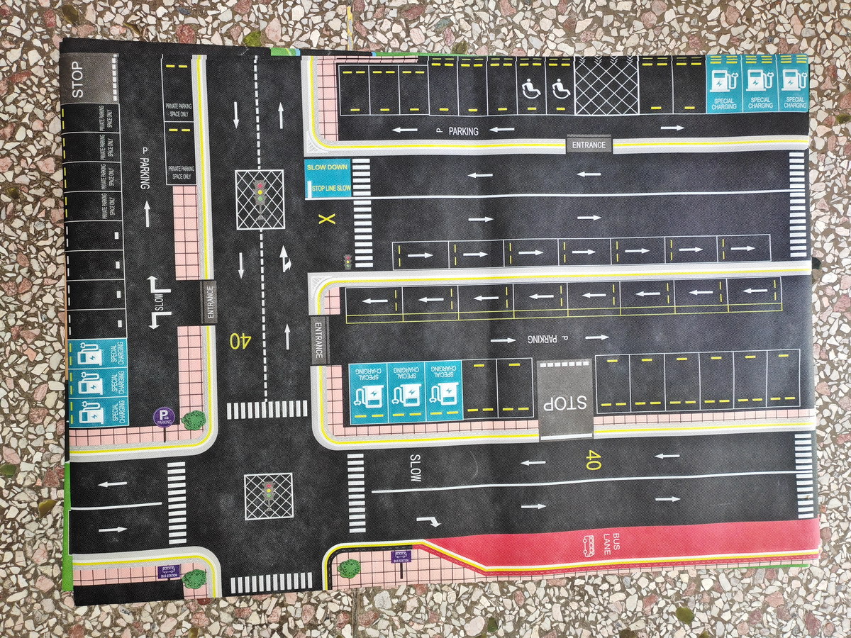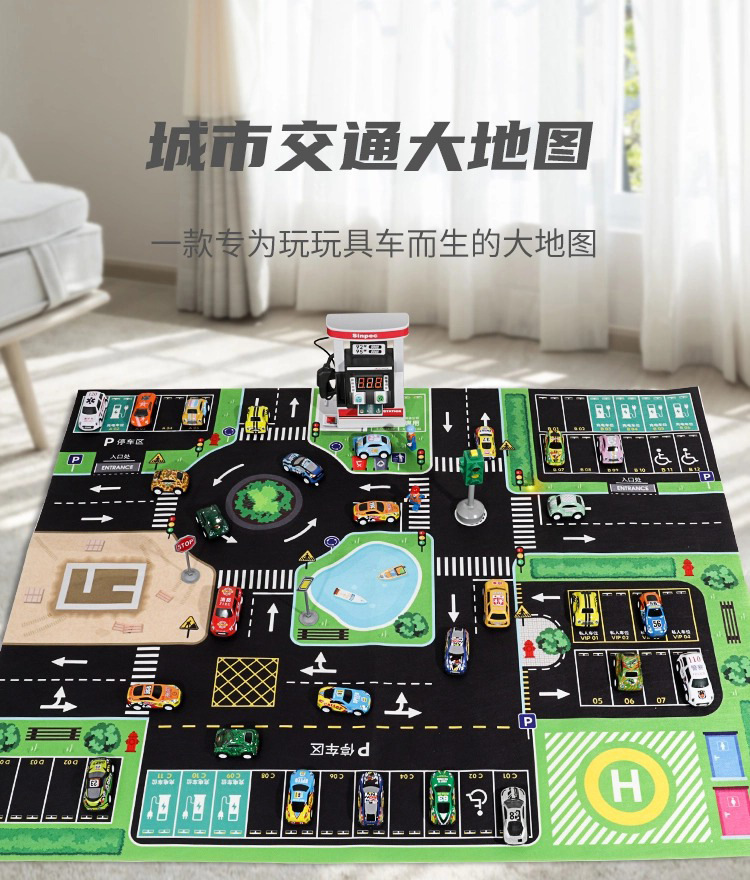 Карта сцены с игрушечными автомобилями, динозаврами, городом, парковкой, невязаный игровой коврик