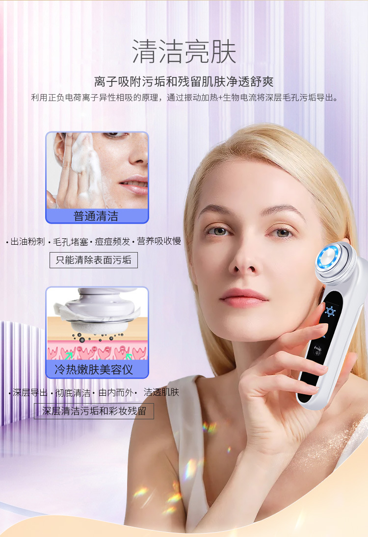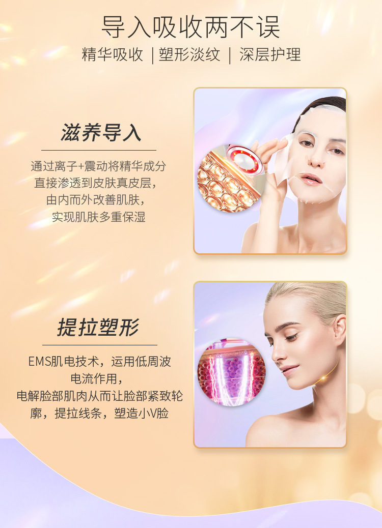 2.离子���动导出,深层清洁导出油脂污垢,保持毛孔干爽清透。离子震动导入,深入肌底,减少流失效果加倍,强化肌底