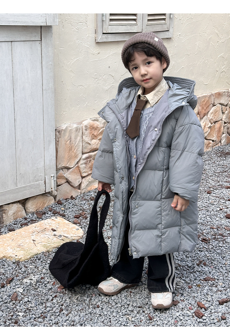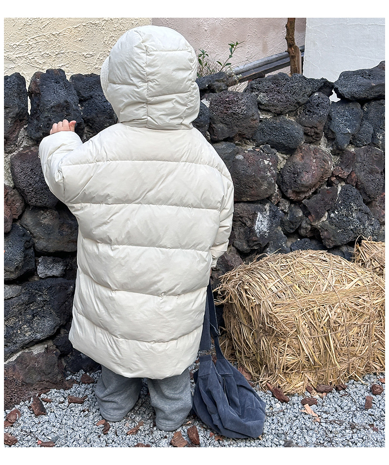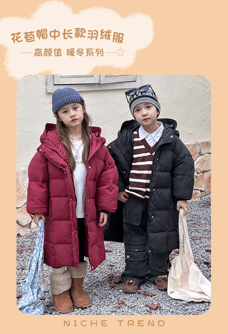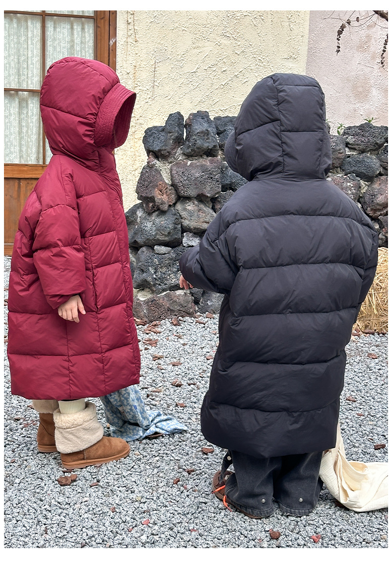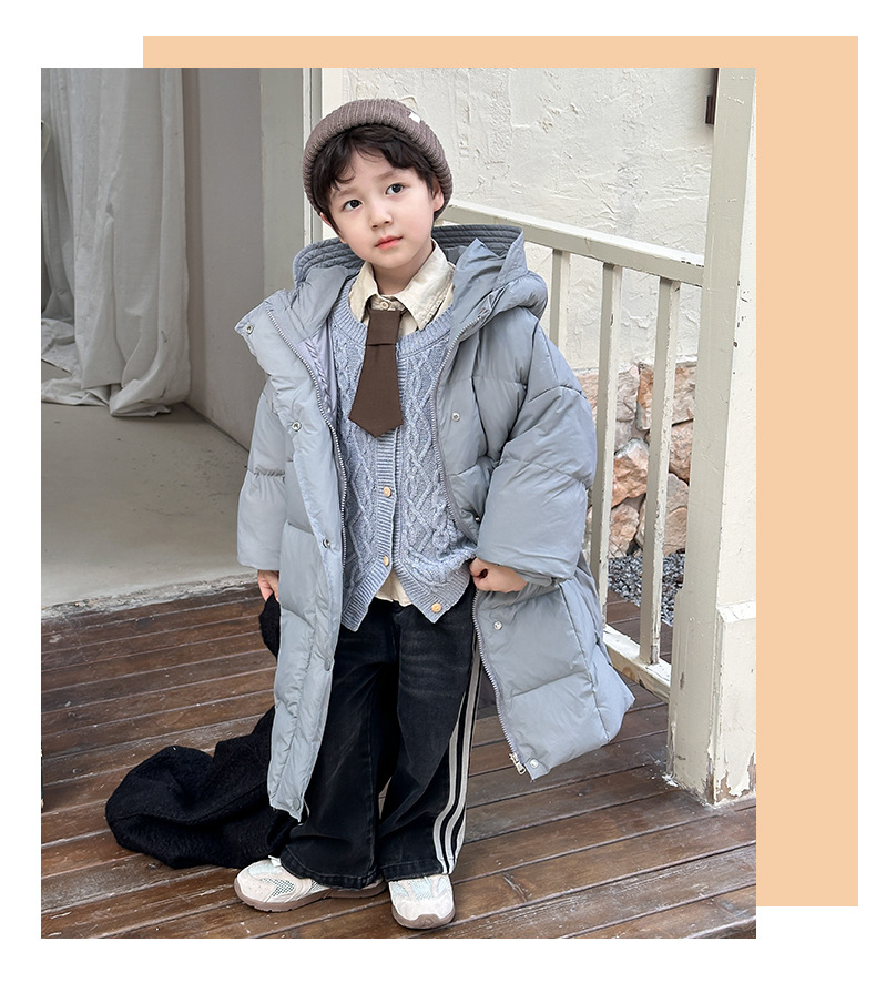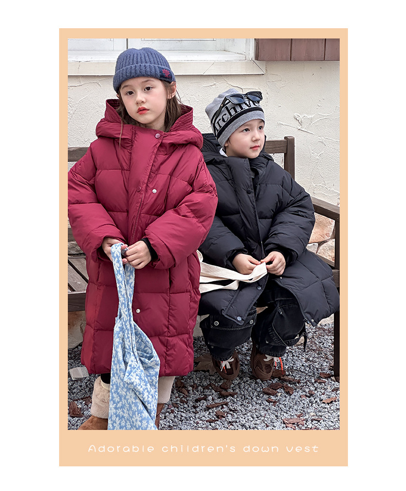Детская зимняя полудлинная пуховка 2024, новый западный стиль, куртка с капюшоном, свободная, утолщенная, для мальчиков и девочек