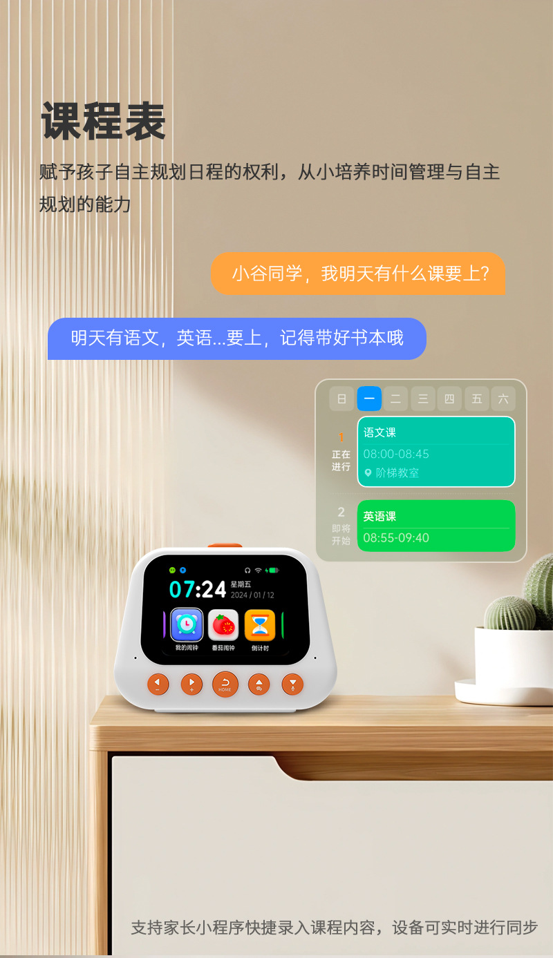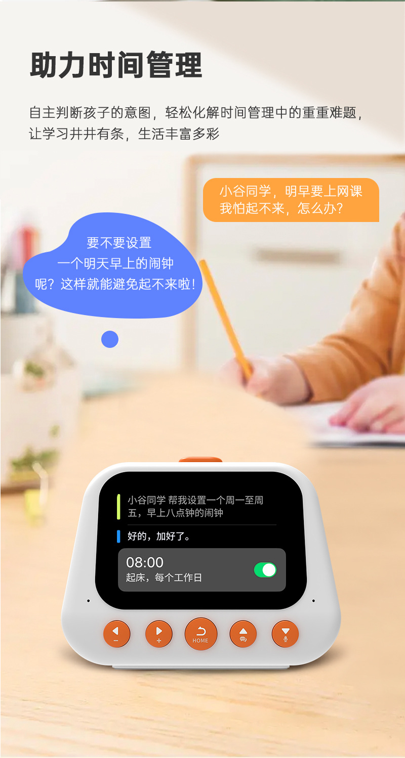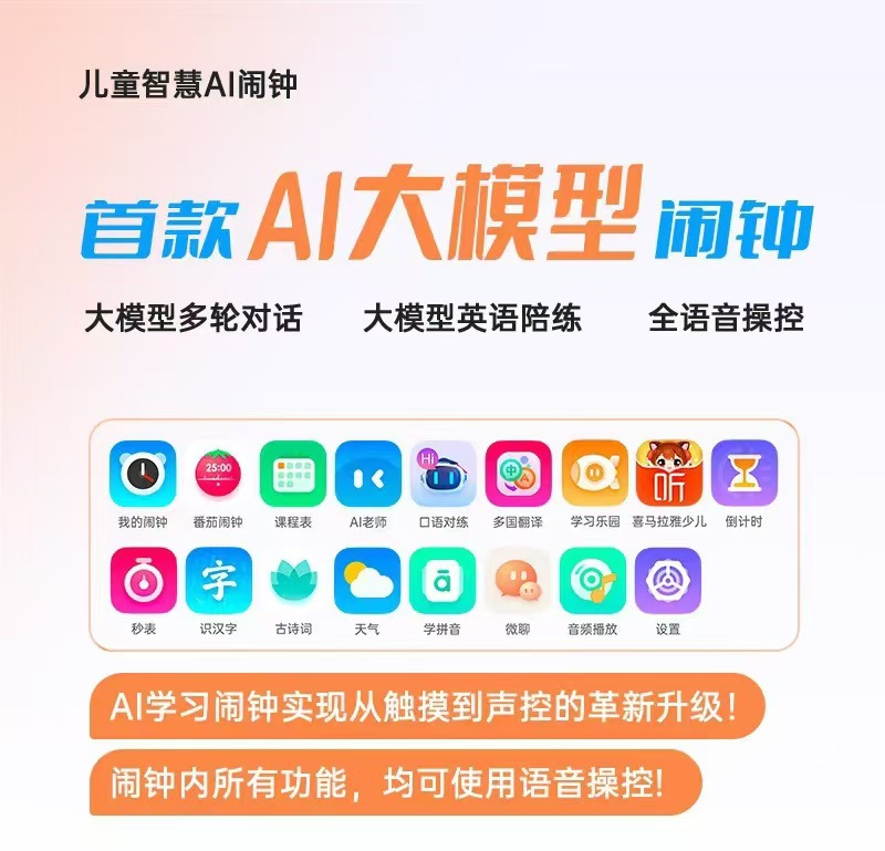 该大模型闹钟现货是【星火大模型】功能(内置了先进的 AI 大模型,它能像贴心的小伙伴一样与孩子交流,执行所有的指令,回答孩子的奇思妙想,比如“星星为什么会眨眼睛?”帮孩子预习/复习知识点