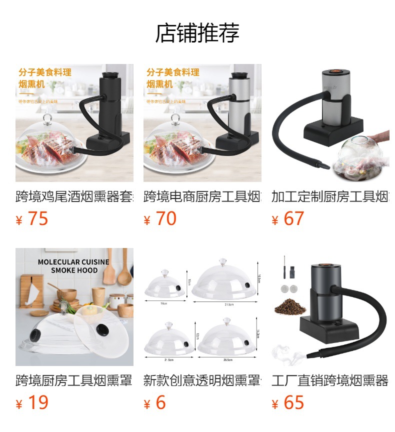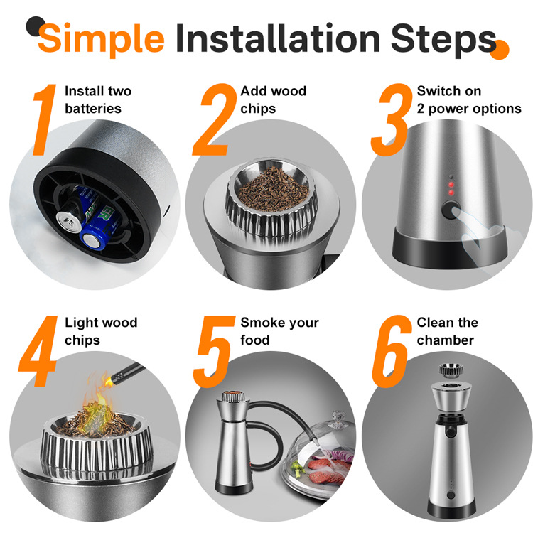 全套配置:1*烟熏机,1*软管,1*刷子,1*螺丝刀,5*过滤网,1*说明书+1瓶核桃木屑+1瓶苹果木屑+1瓶樱桃木屑+1瓶橡木木屑
