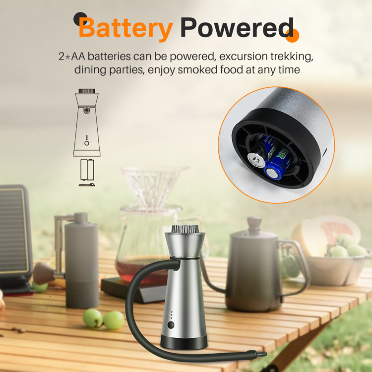 步骤3.将烟熏料放入烟熏枪,开启电源按钮,可以根据出烟大小调节
