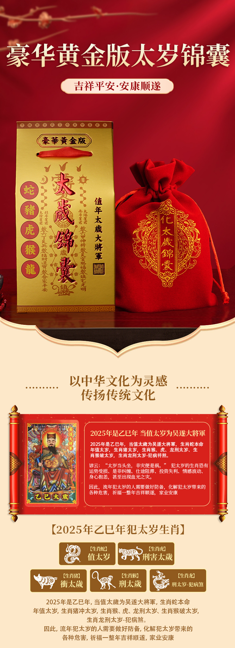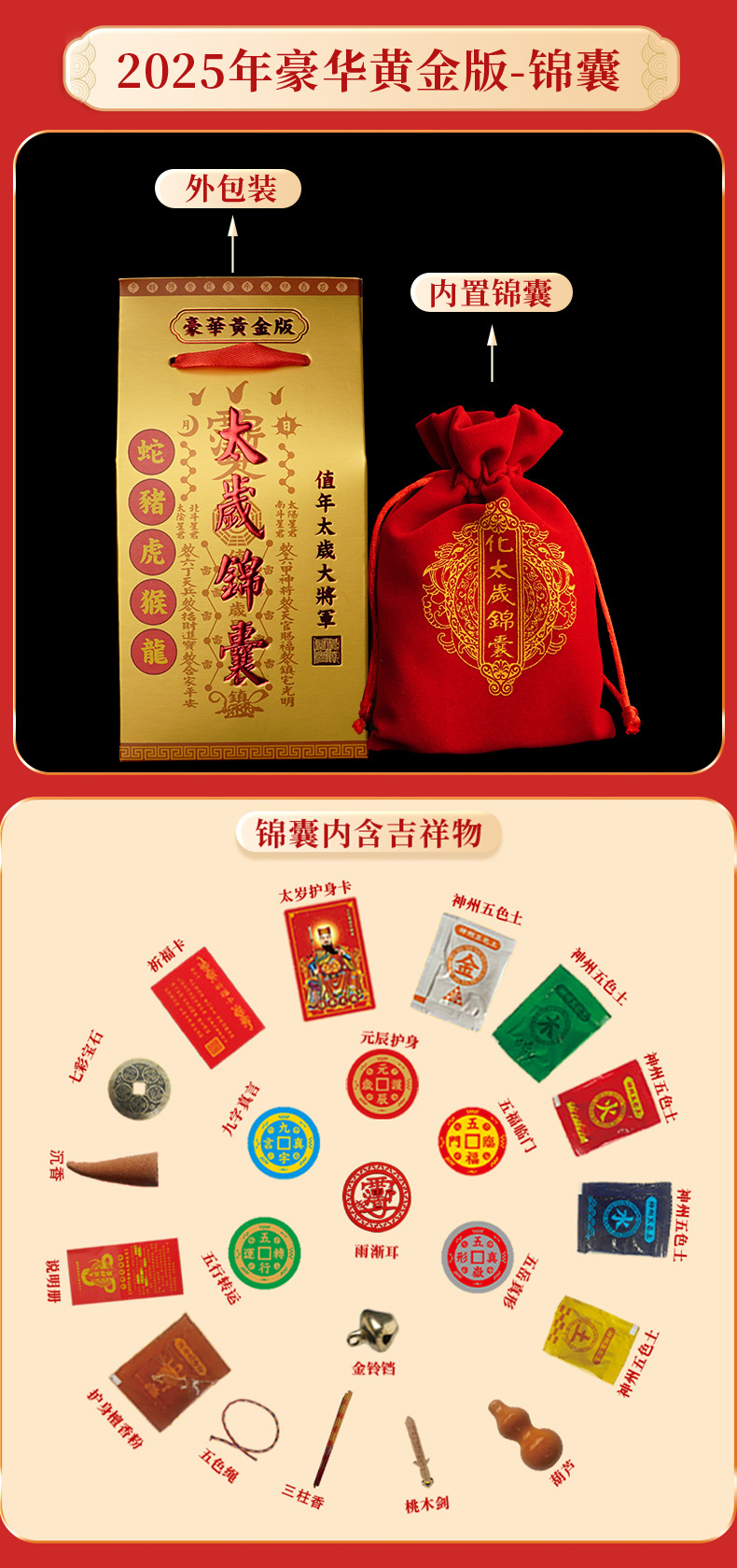 Роскошная золотая версия Тай Суй 2025 года, сумка второго года Змеи, Свиньи, Тигра, Обезьяны, Дракона