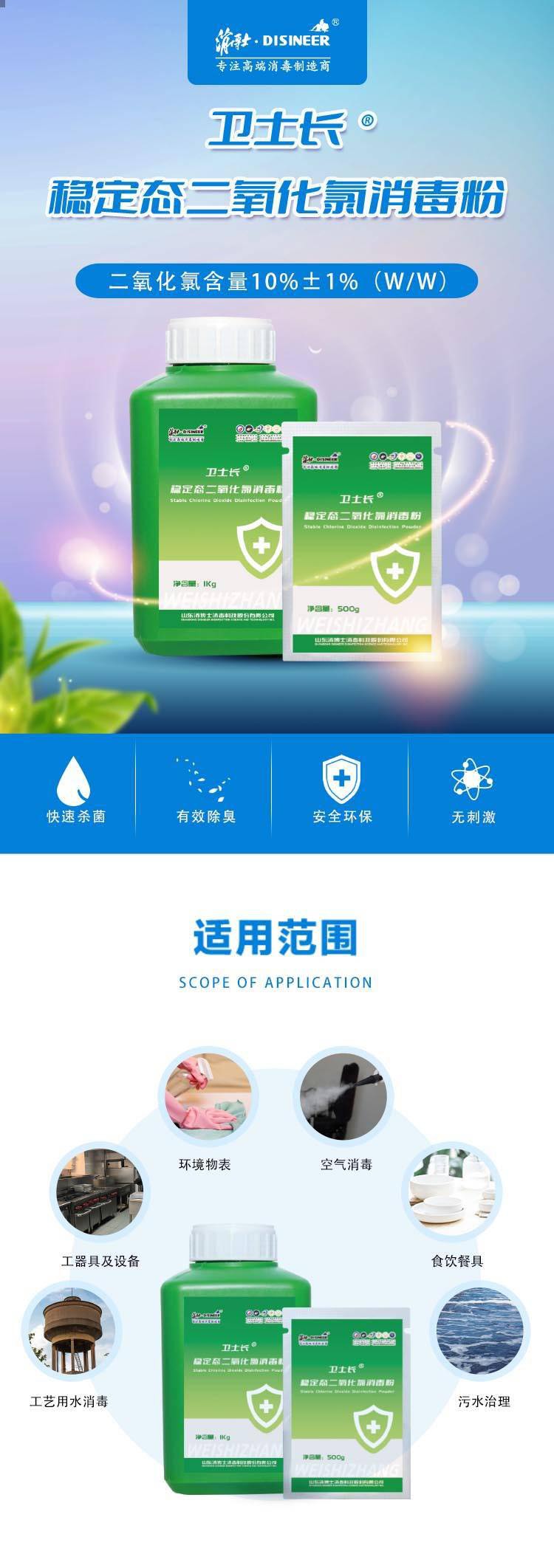 Стабильный порошок хлора диоксида для дезинфекции бассейнов, горячих источников, домашнего использования, пищевых производств и антимикробной обработки посуды для еды и напитков