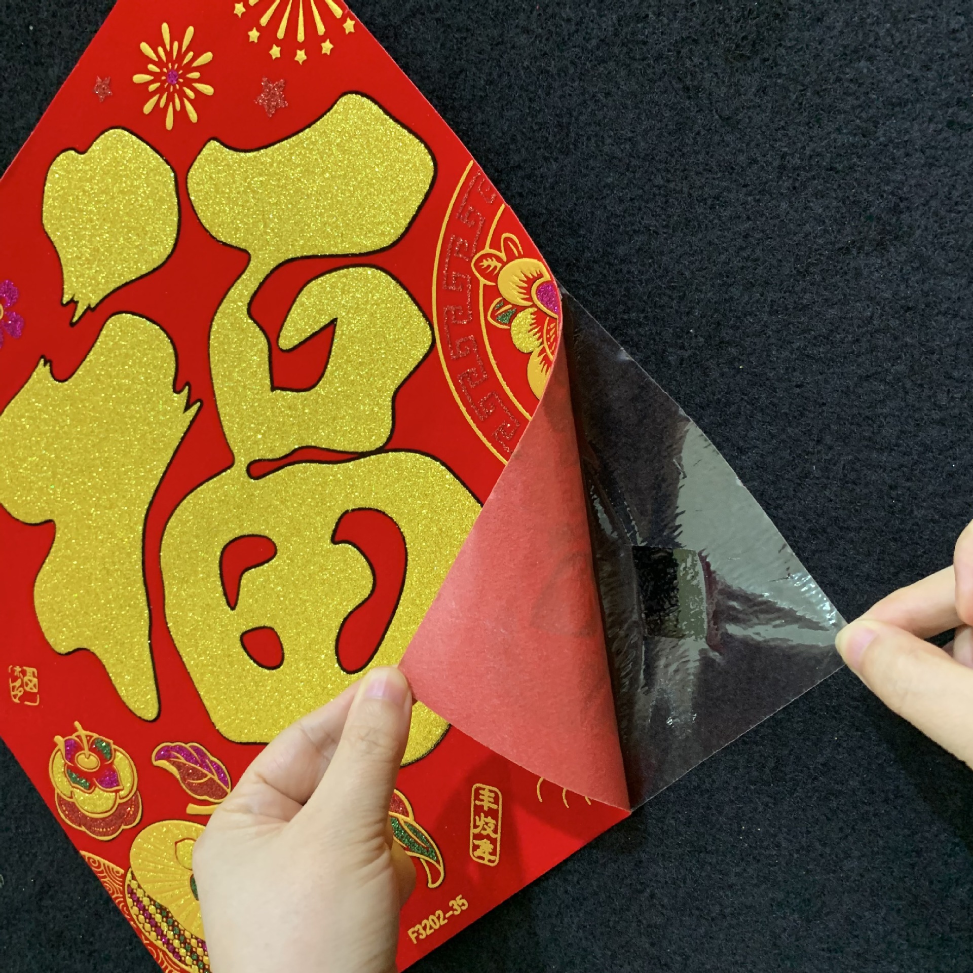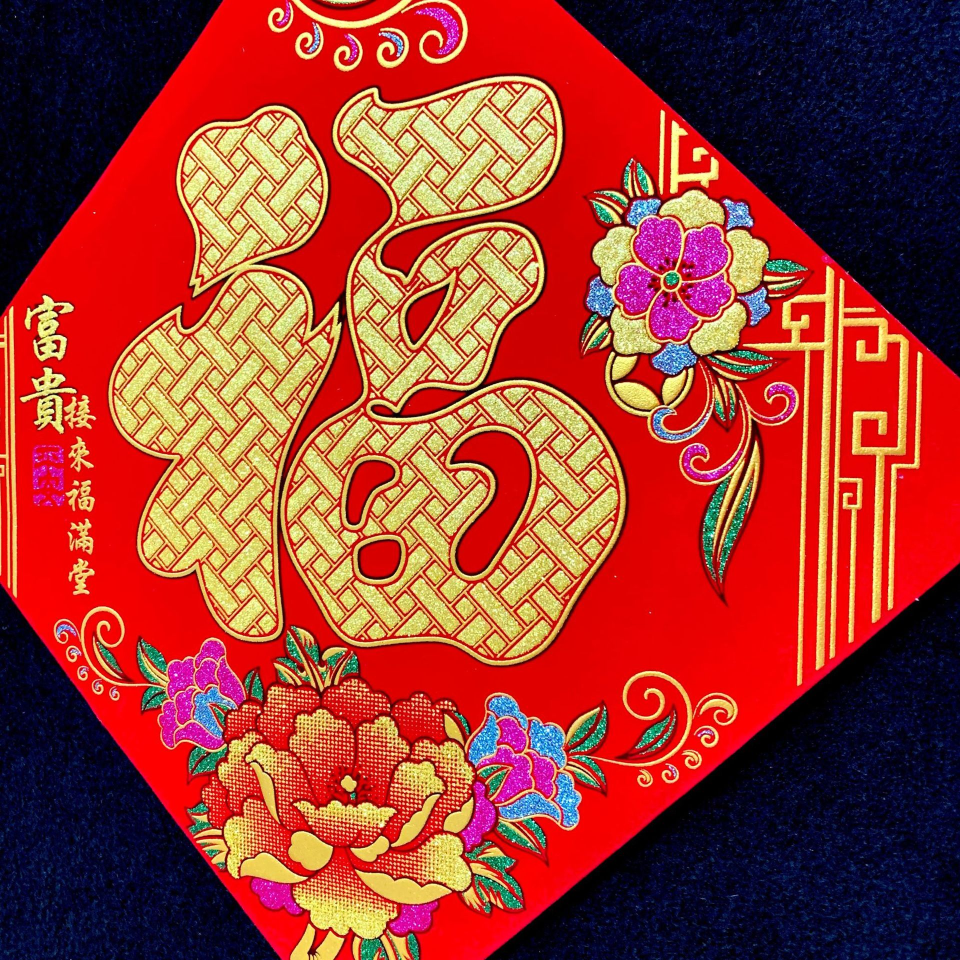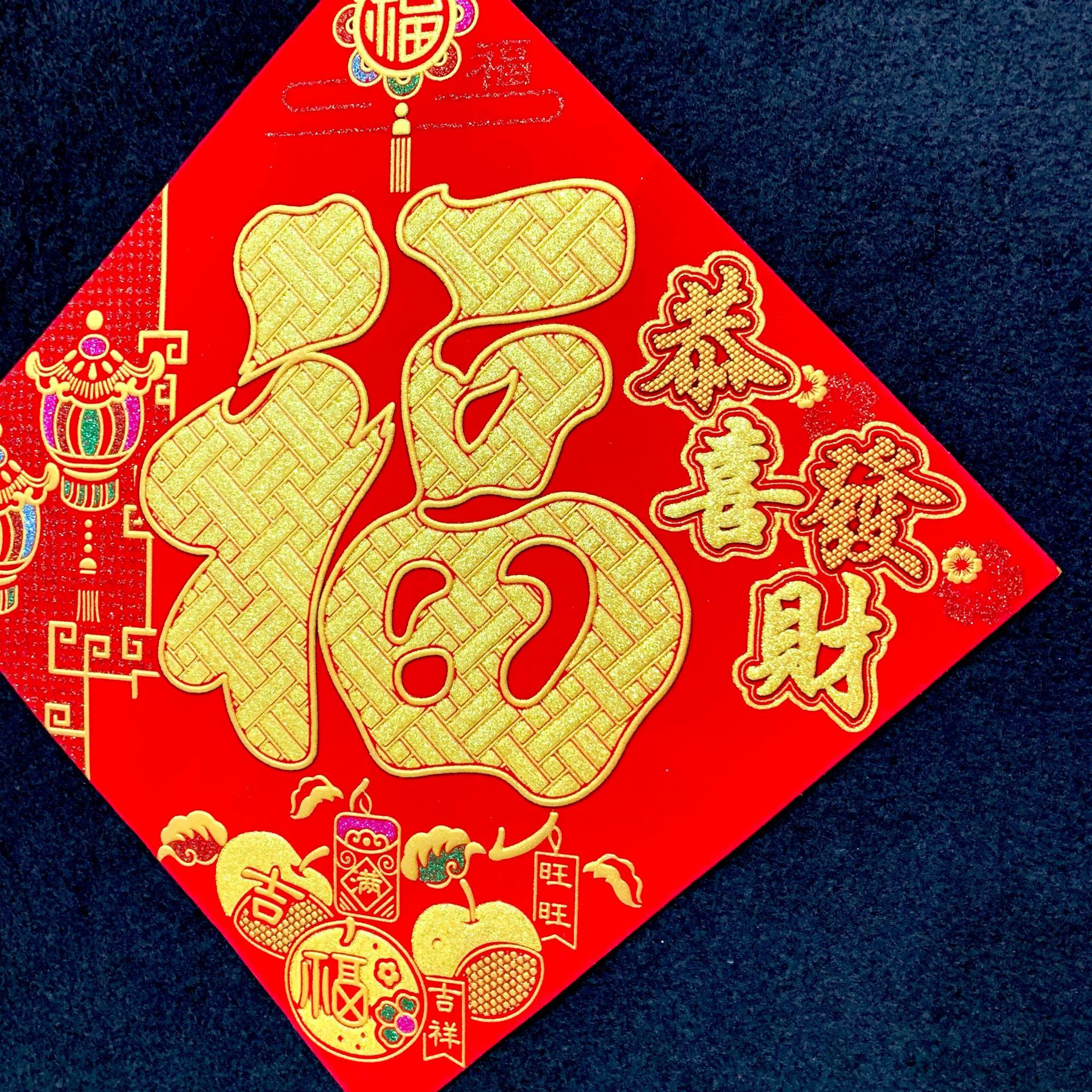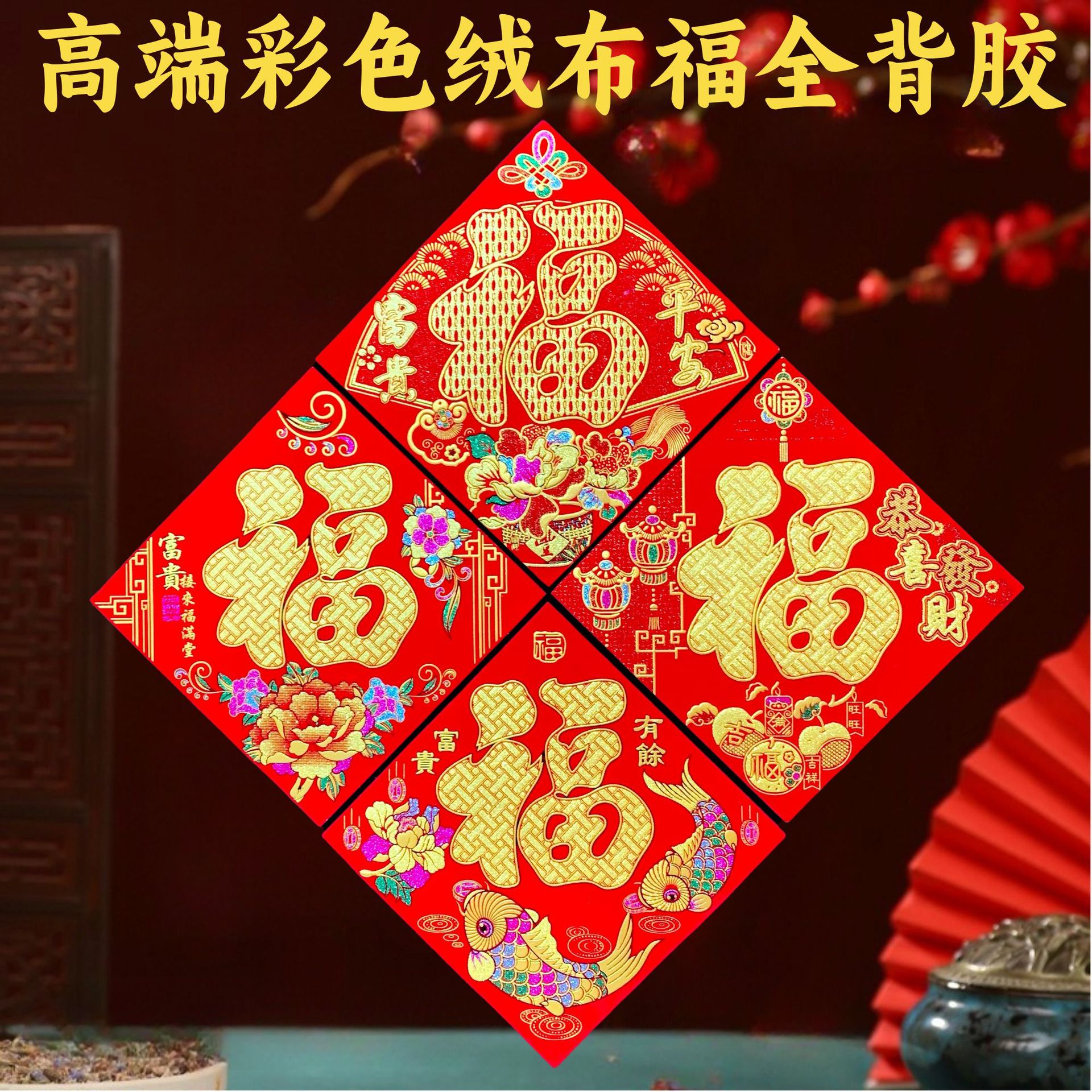高端彩色绒布福字,全背胶加厚绒布纯手工发泡,.实际尺寸:40# 33.5cm,一件900张装,四个款式可混搭发货,整件拿清装私聊优惠,加厚绒布纯手工发泡6到7彩色工艺全背胶,款式高端大气上档次……实物比照片更漂亮更有质感,质量保证相信品牌的品质