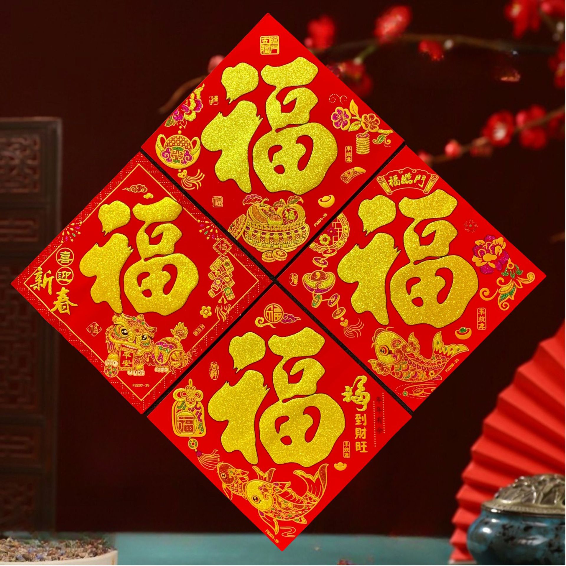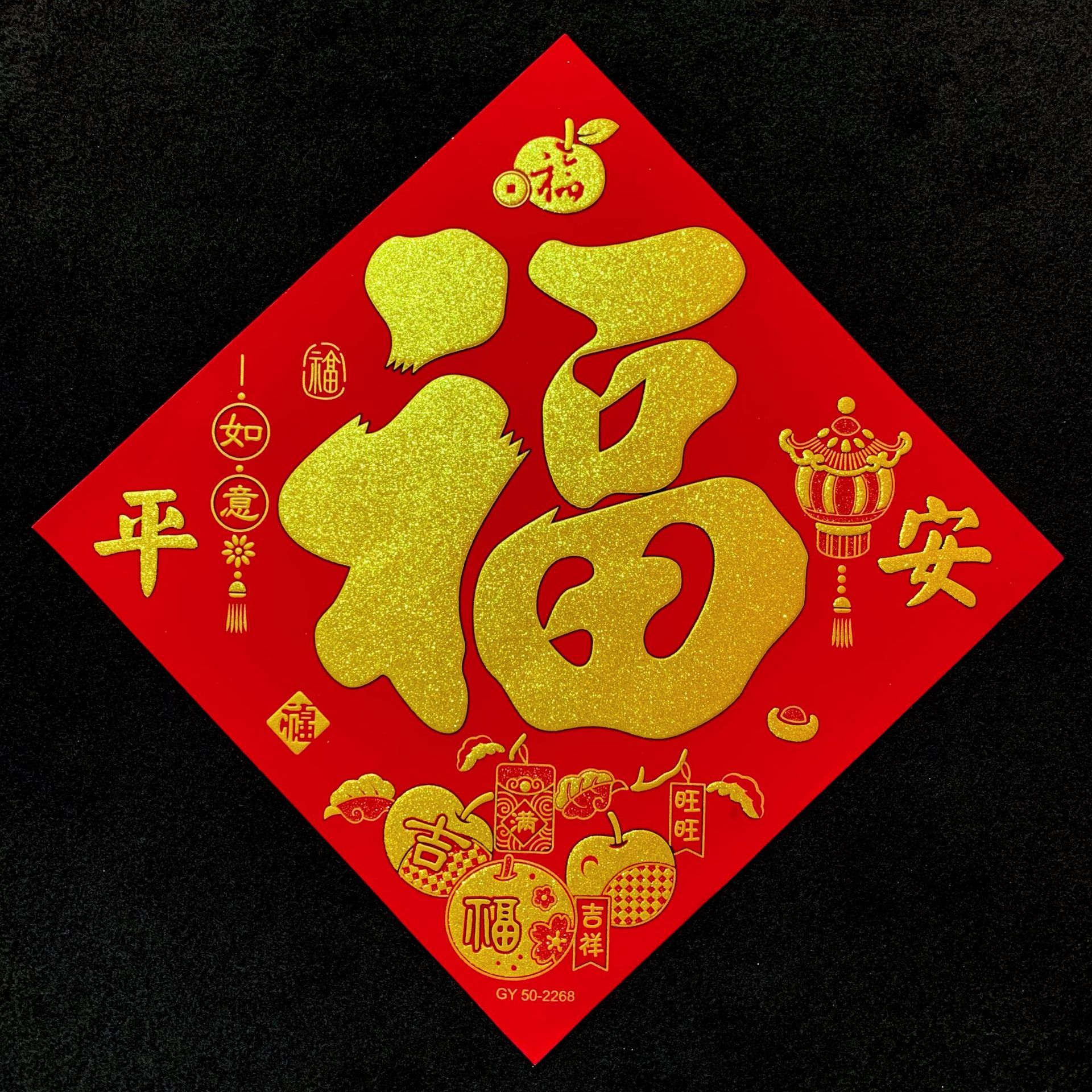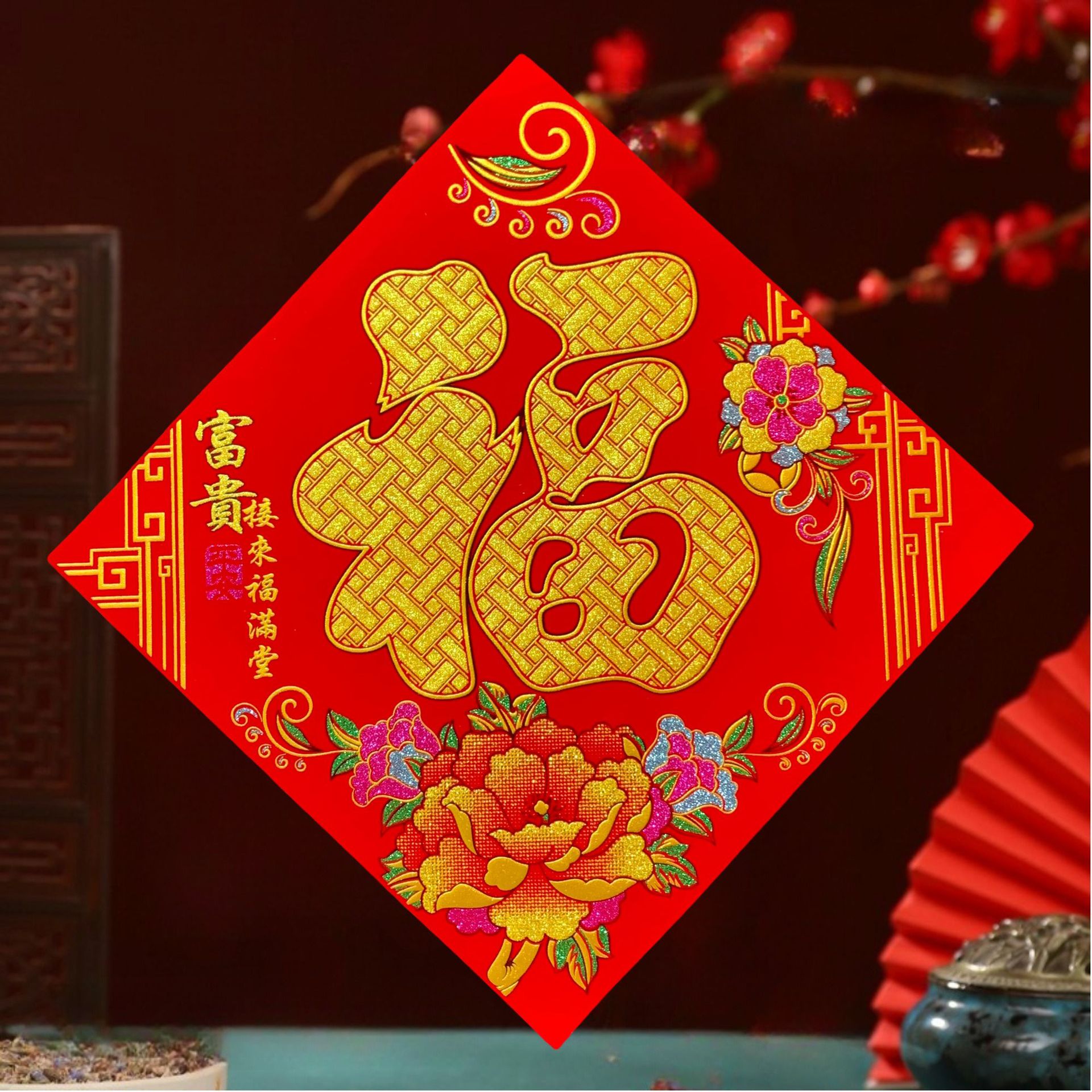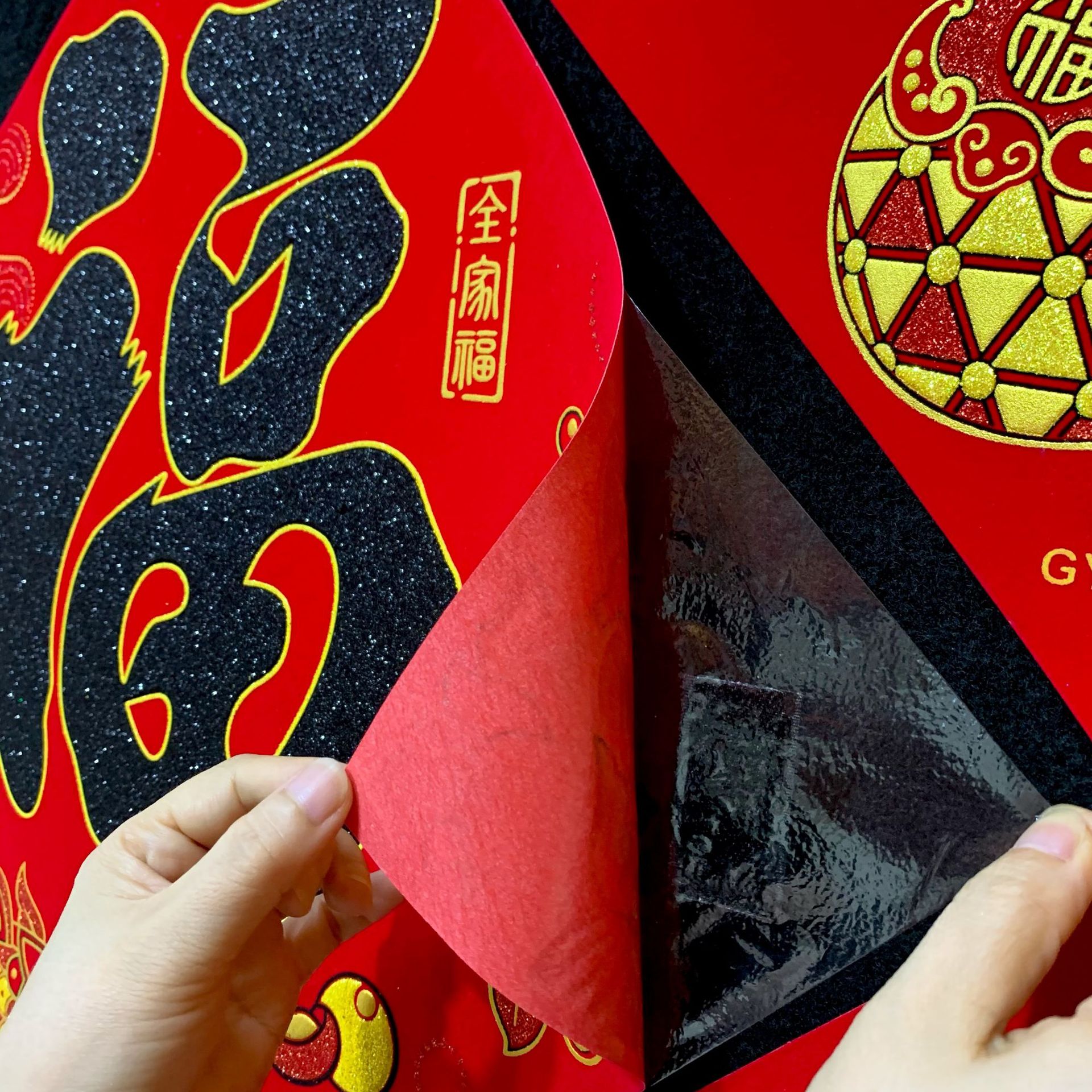 高端彩色绒布福字,全背胶加厚绒布纯手工发泡,.实际尺寸:40# 33.5cm,一件900张装,四个款式可混搭发货,整件拿清装私聊优惠,加厚绒布纯手工发泡6到7彩色工艺全背胶,款式高端大气上档次……实物比照片更漂亮更有质感,质量保证相信品牌的品质