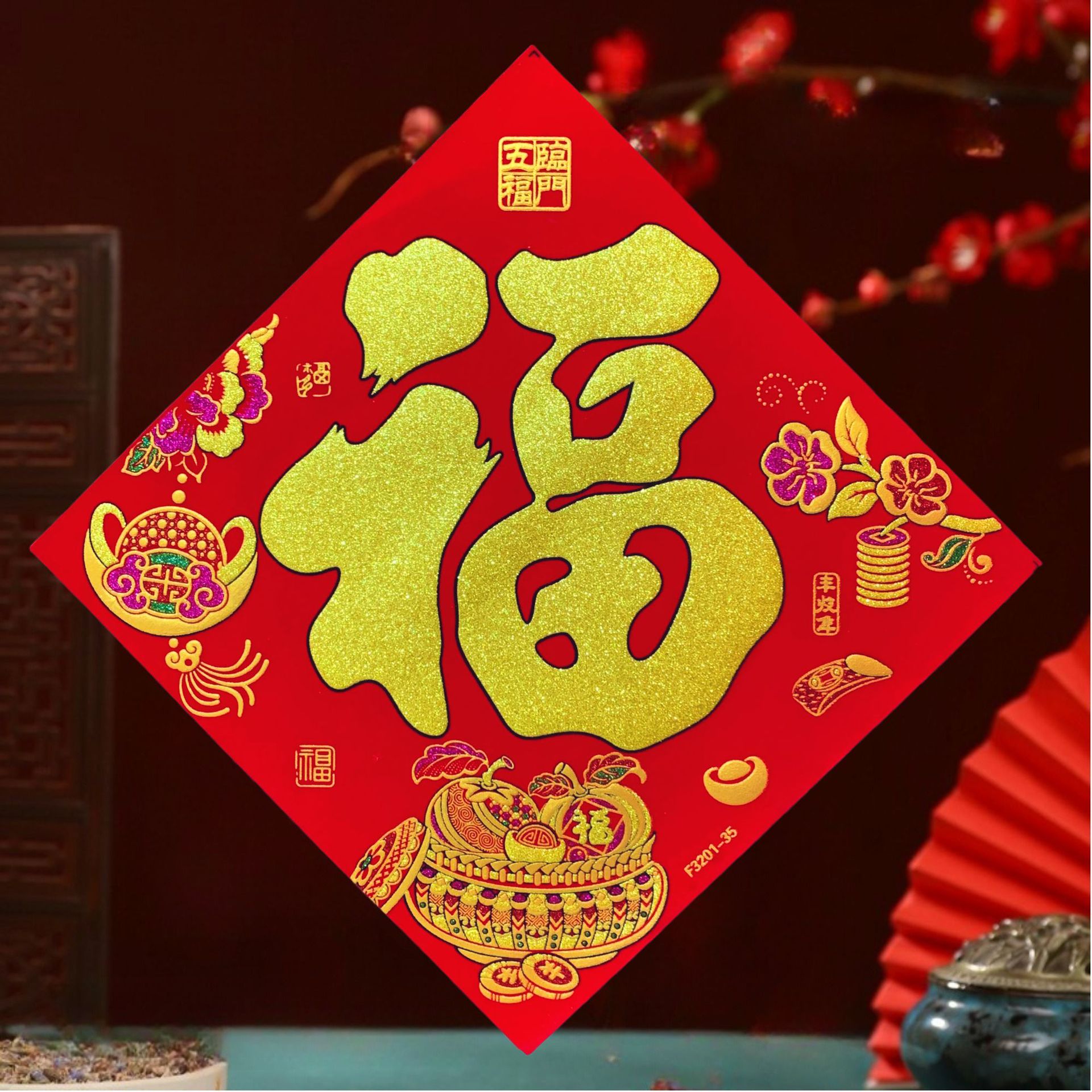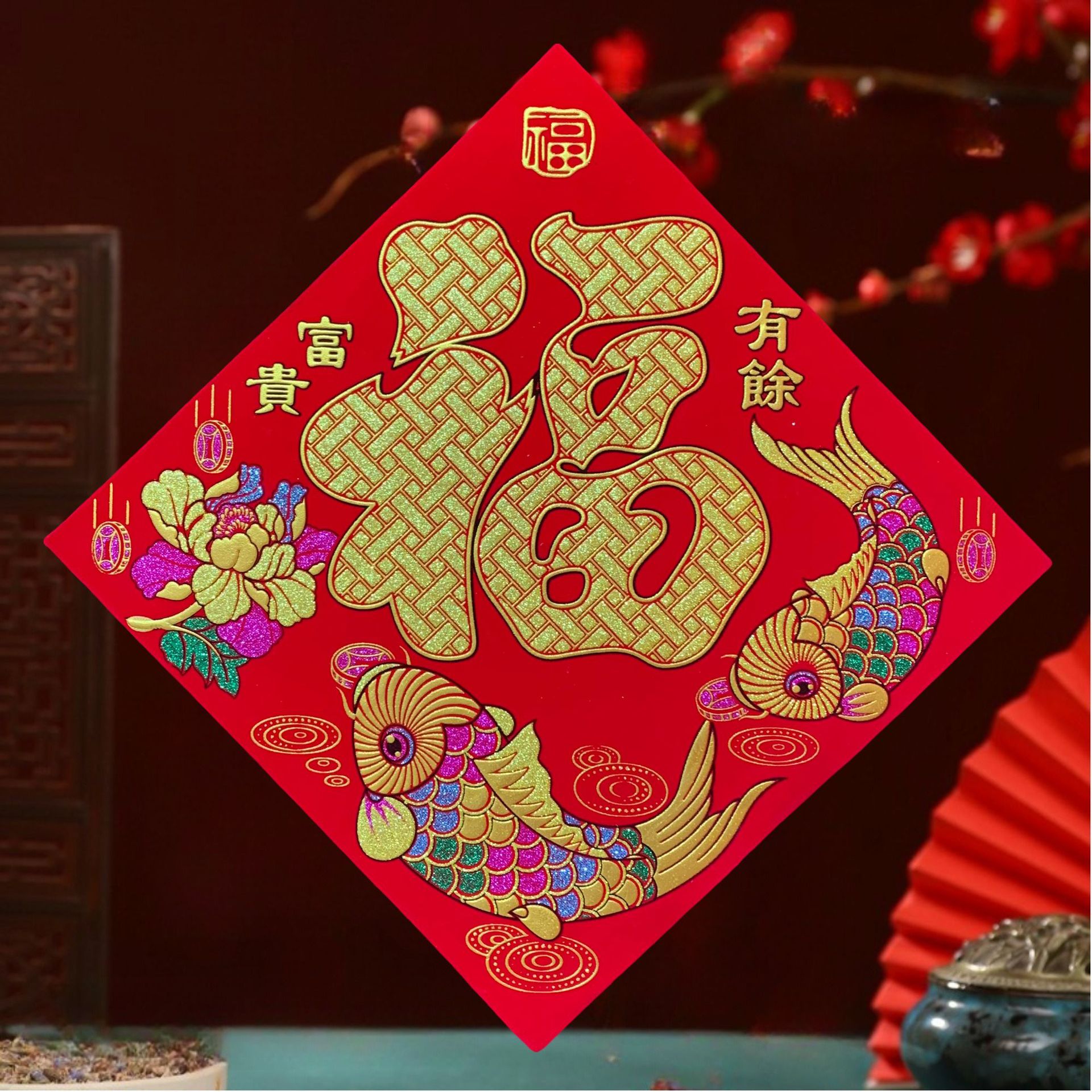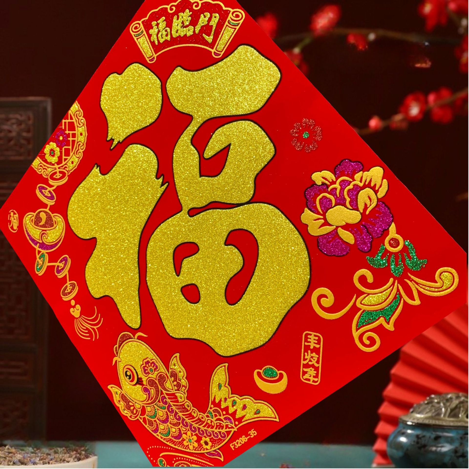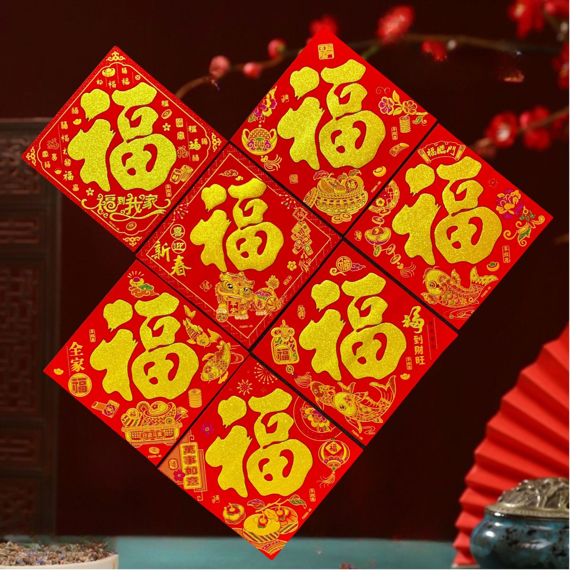 高端彩色绒布福字,全背胶加厚绒布纯手工发泡,.实际尺寸:40# 33.5cm,一件900张装,四个款式可混搭发货,整件拿清装私聊优惠,加厚绒布纯手工发泡6到7彩色工艺全背胶,款式高端大气上档次……实物比照片更漂亮更有质感,质量保证相信品牌的品质