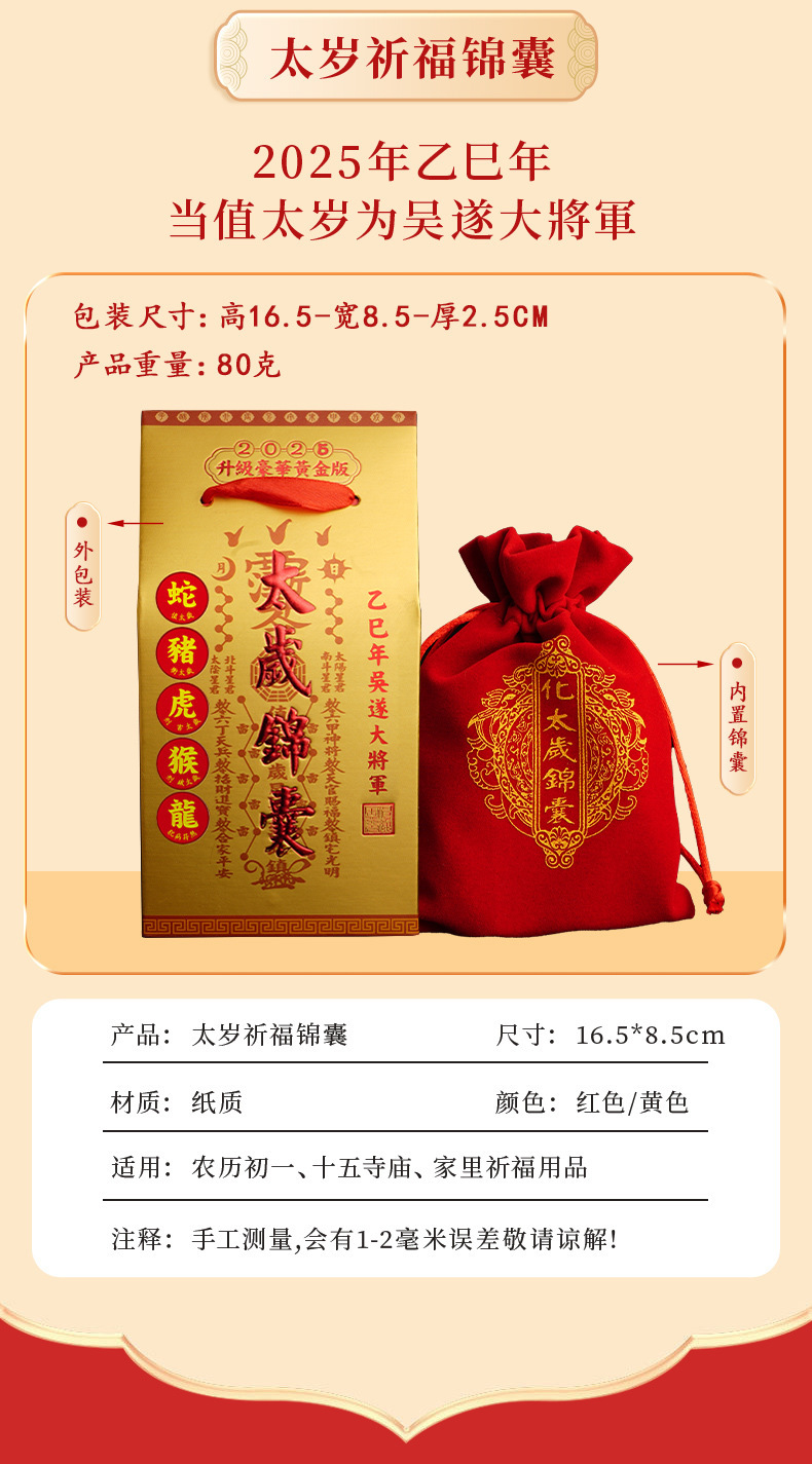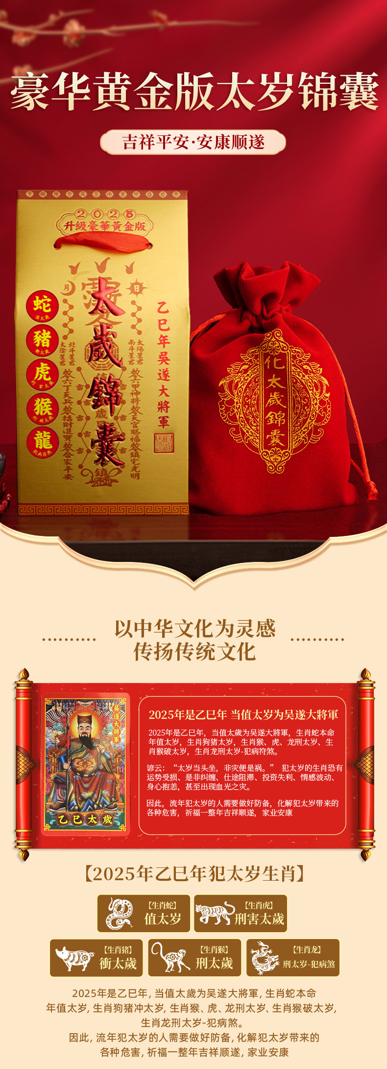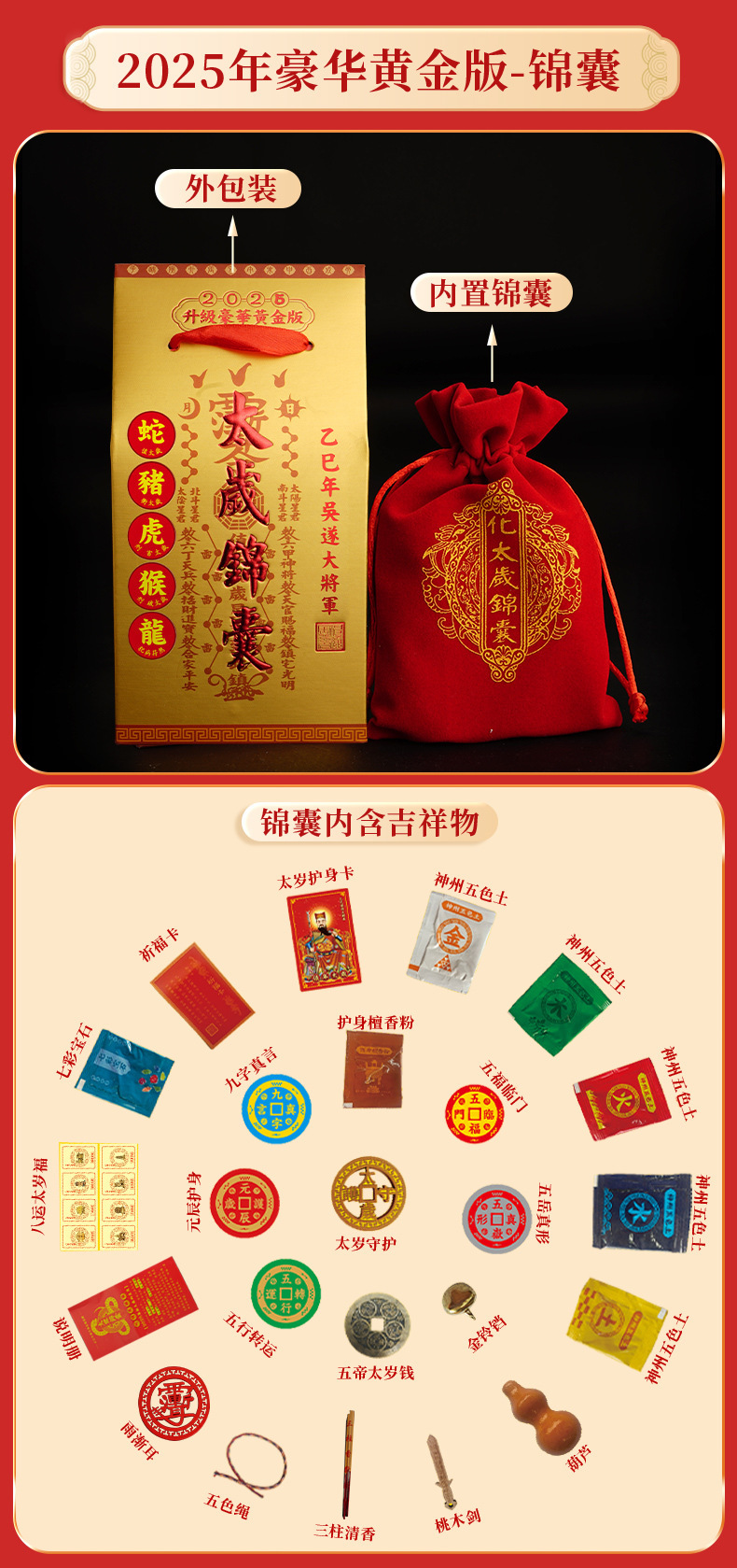 Роскошная золотая версия Тай Суй 2025 года, сумка второго года Змеи, Свиньи, Тигра, Обезьяны, Дракона