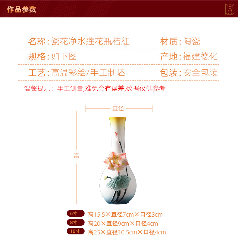 ![]() | 6inch porcelain flower water purification lotus bottle orange | No specifications | ¥40.0 / ≈ 483 ₽ | 200 | 5621427657335 | |
