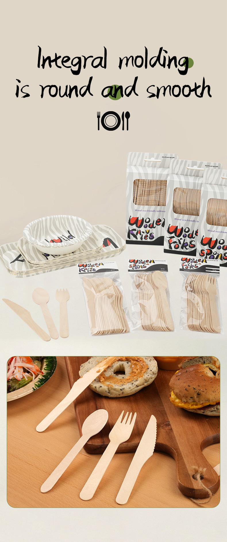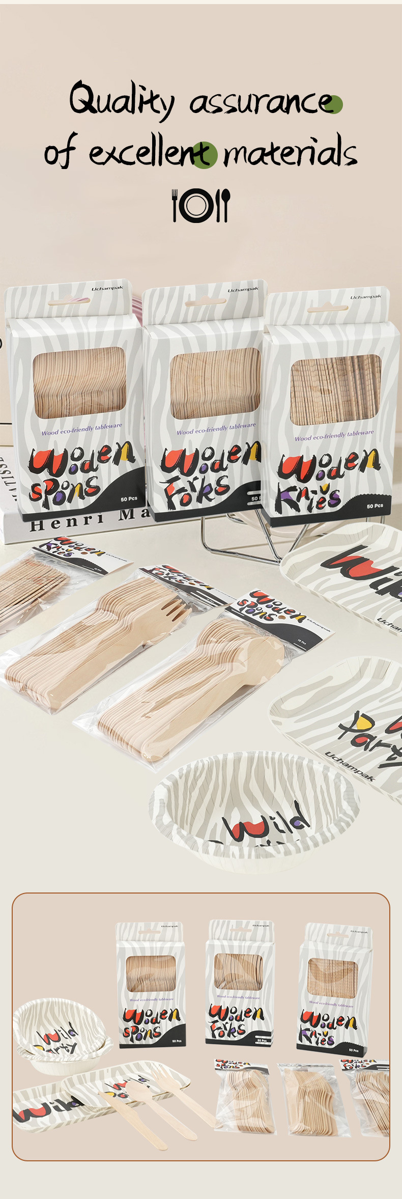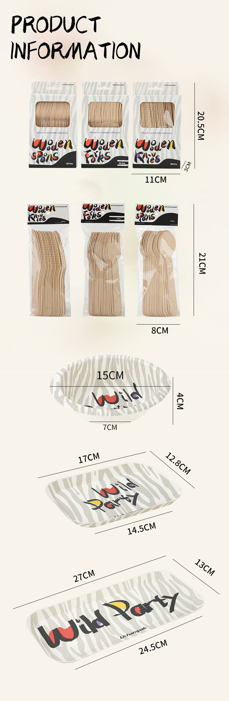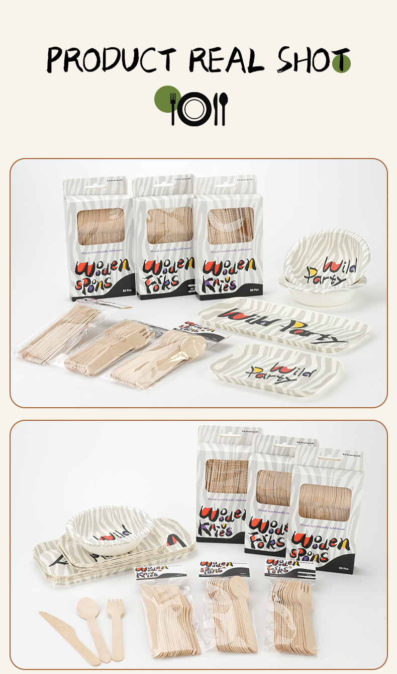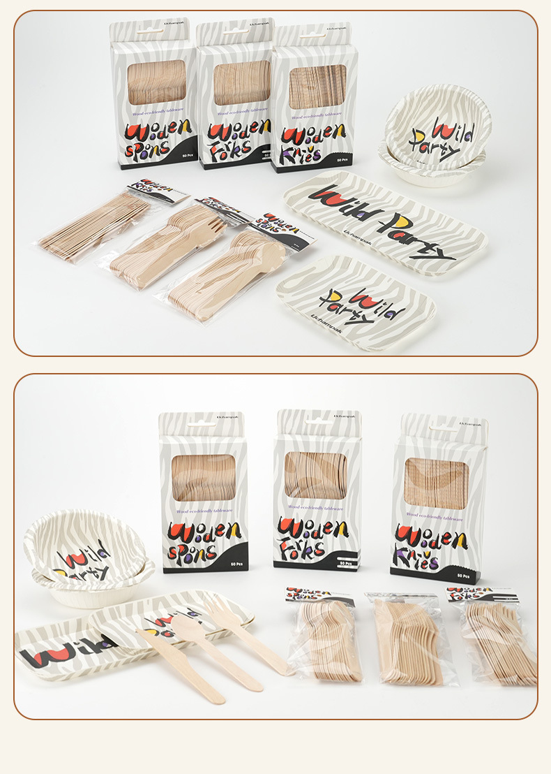 Набор одноразовой посуды с деревянными ножами, вилками и ложками, зебровый принт