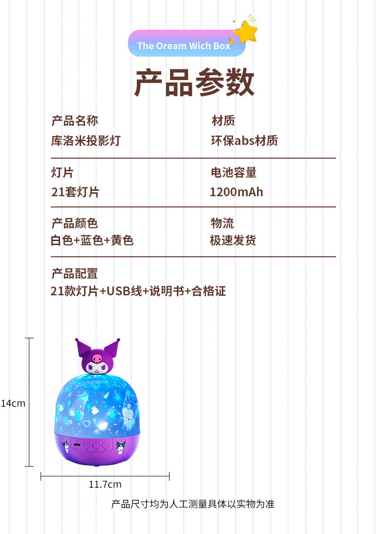 产品标配:梦幻皇冠投影灯*1;USB电源线*1;说明书*1;投影胶片*21;遥控器*1(仅充电款)