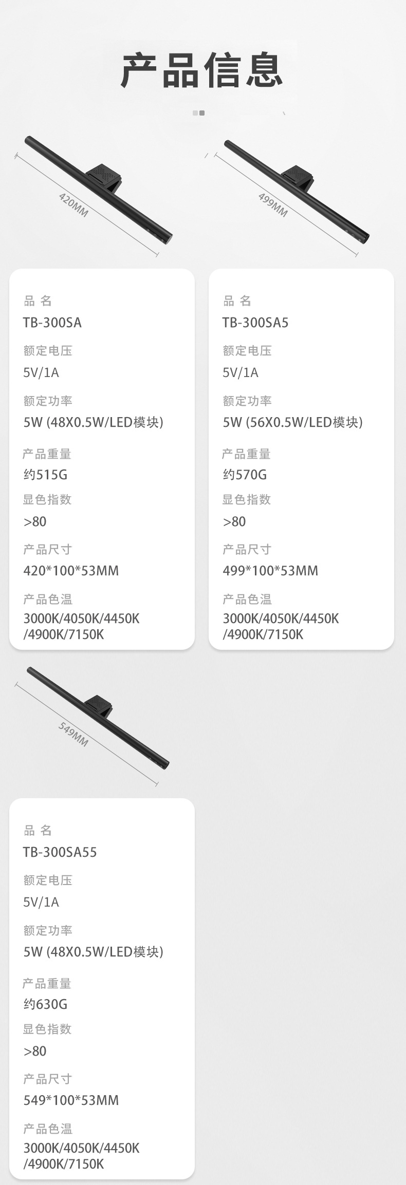 产品型号:TB-300SA(420MM) 铝合金屏幕挂灯(插电款)