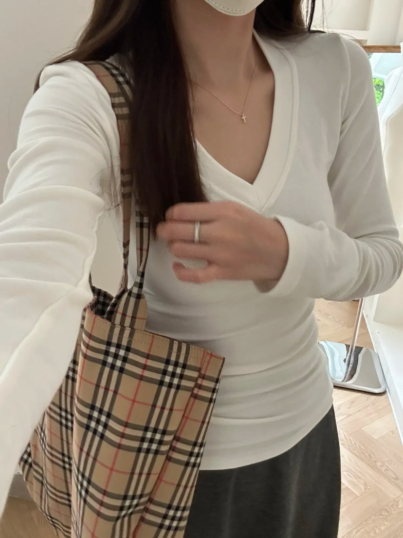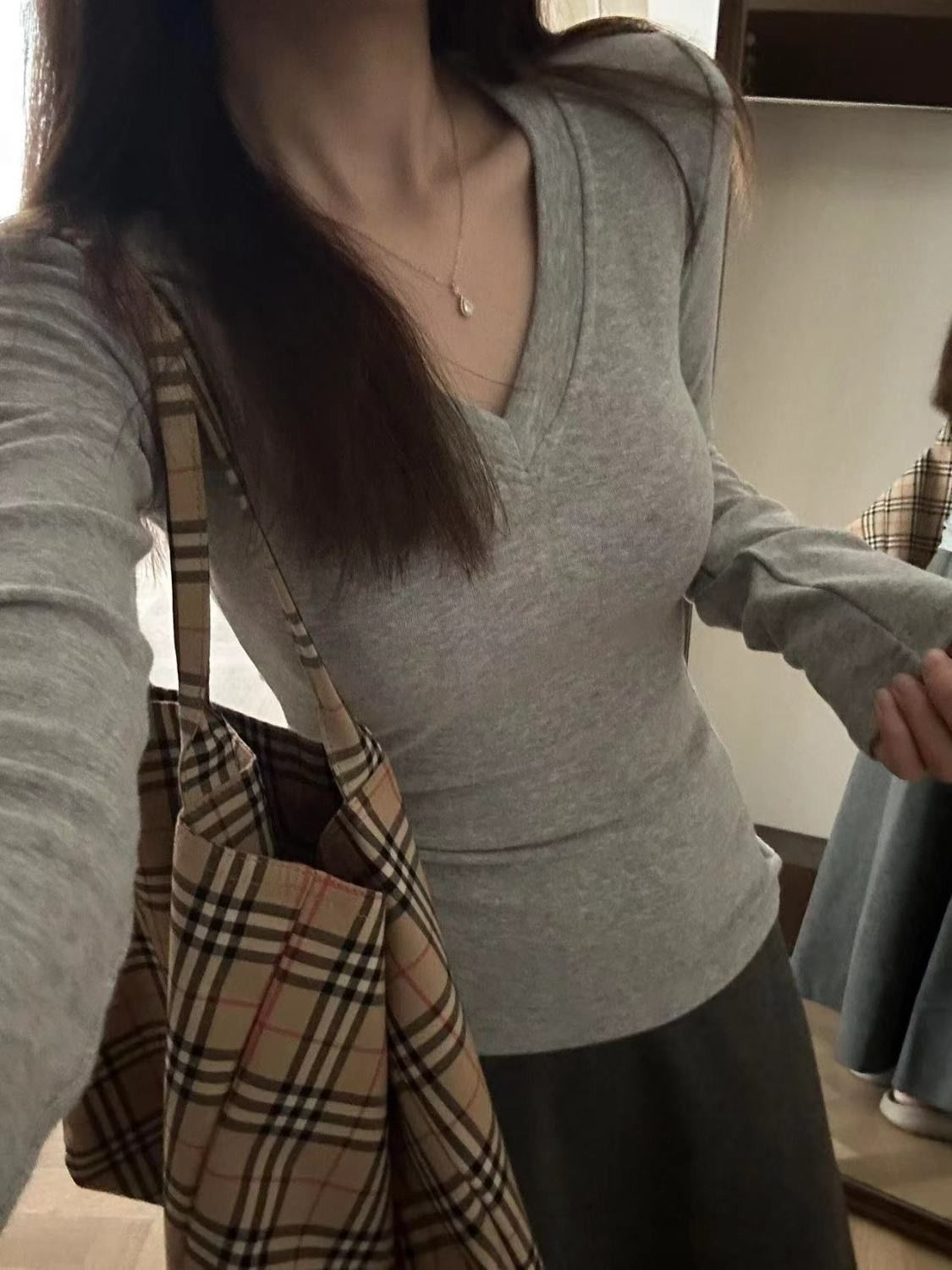 Футболка с V-образным вырезом, немецкий бархат, сексуальная, длинный рукав, осень-зима 2025, новый стиль, стройная теплая базовая футболка