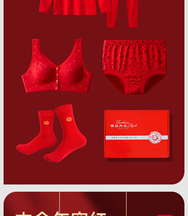 ![]() | [4-piece round neck box] 7704 red suit + 1 blessing bra + 1 blessing underwear + 1 socks | Xl size [suitable for 52.5-60kg ] | ¥75.0 / ≈ 912 ₽ | 99 | 5640661577597 | |