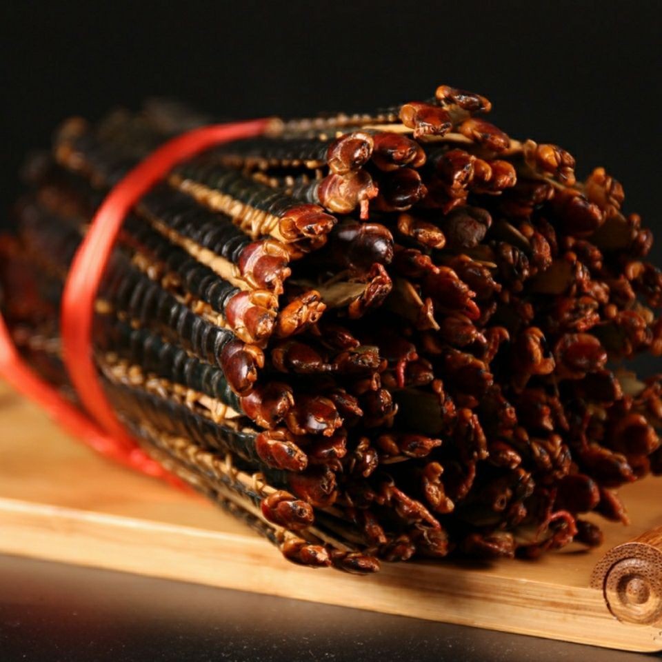 Многоножка, которую можно измельчить. Красноголовая многоножка из Хубэя, можно замочить в вине и использовать как лекарство. Также есть целые скорпионы.