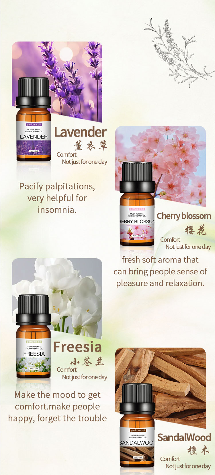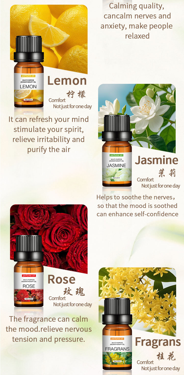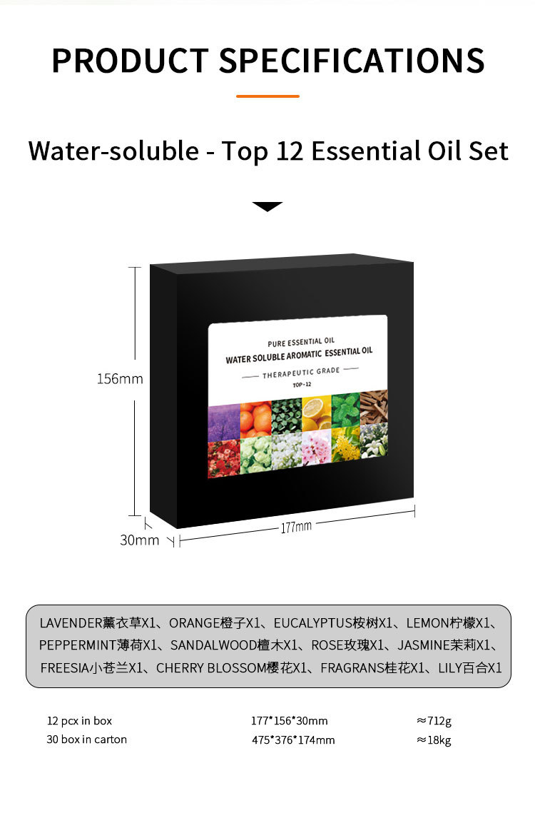 - [薰衣草,甜橙,桉树,柠檬,薄荷,檀香,玫瑰,茉莉,小苍兰,樱花,桂花,百合,12种人气香味套装。 非常适合放松、睡觉、工作、冥想,或只是为您的空间增添清新香味。