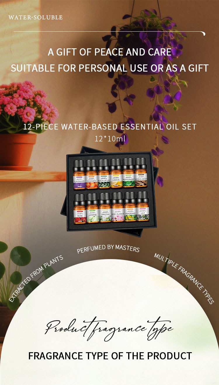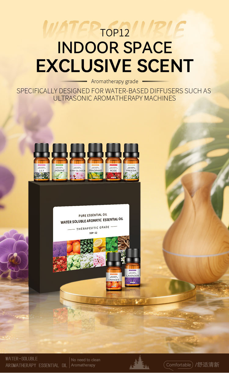 This essential oil set is specially designed for water-based diffusers such as ultrasonic aroma diffusers. The water-soluble formula can be easily mixed with water, helping to prevent clogging and ensuring a smooth and stable spray. If you use a diffuser that requires water, this is the perfect choice.