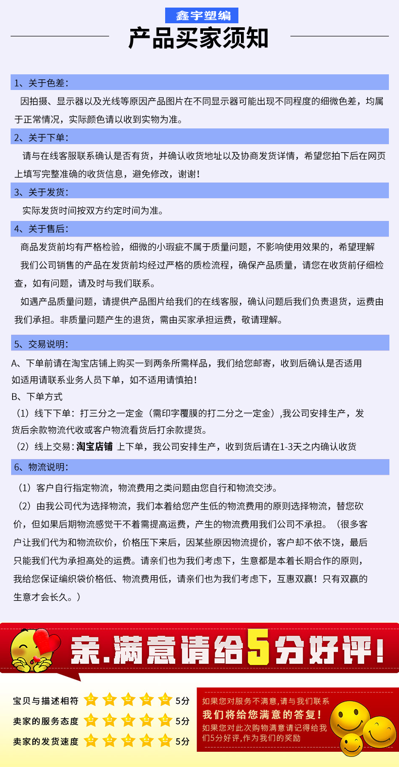 编织袋有下料尺寸和实际尺寸(宽*长,单位CM),由于编织袋筒料经过剪裁下料折叠再缝合成袋子,缝制成品后宽度会有1-3CM左右收缩,长度会短3-10CM左右长度包括底部缝起来的部分,需要成品袋尺寸的亲们请注意哈!