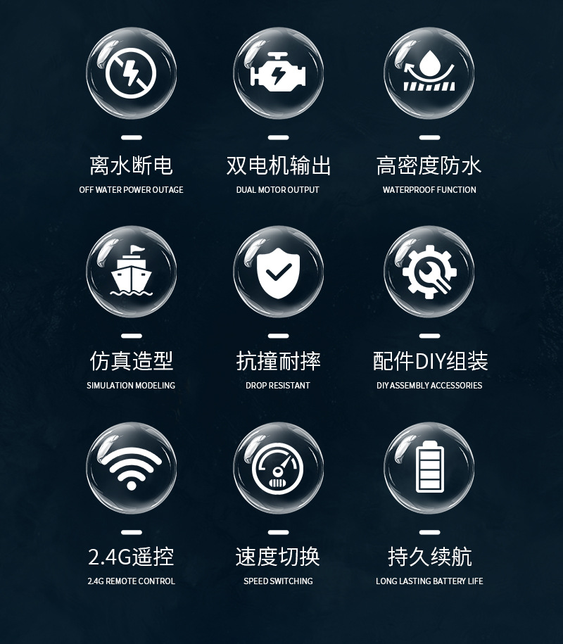 Избранная функция 2.4g wireless remote control, powered on in the water, powered off from the water, low voltage reminder, diy assembled exquisite accessories, anti-collision and drop-resistant, dual motor output, highly waterproof