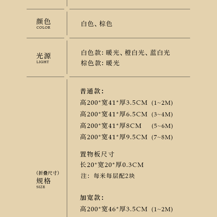 ![]() | Height 210 width 46 length 700-800cm brown warm light three-layer storage | ¥4798.0 / ≈ 58 361 ₽ | 999 | 5726308417593 | |