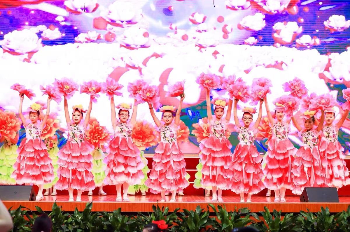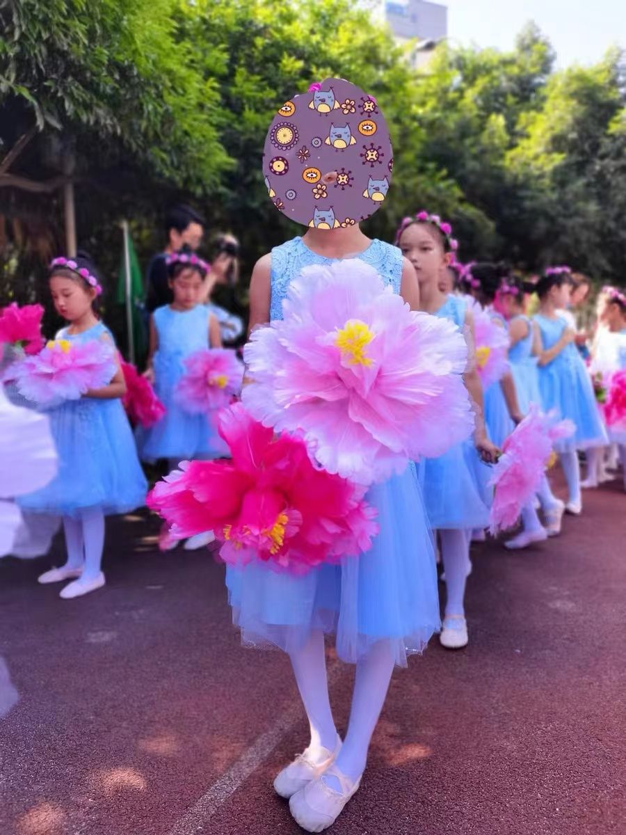 Маленькие дети с пионами в руках, реквизиты для танцевального выступления, цветы для сценических игр