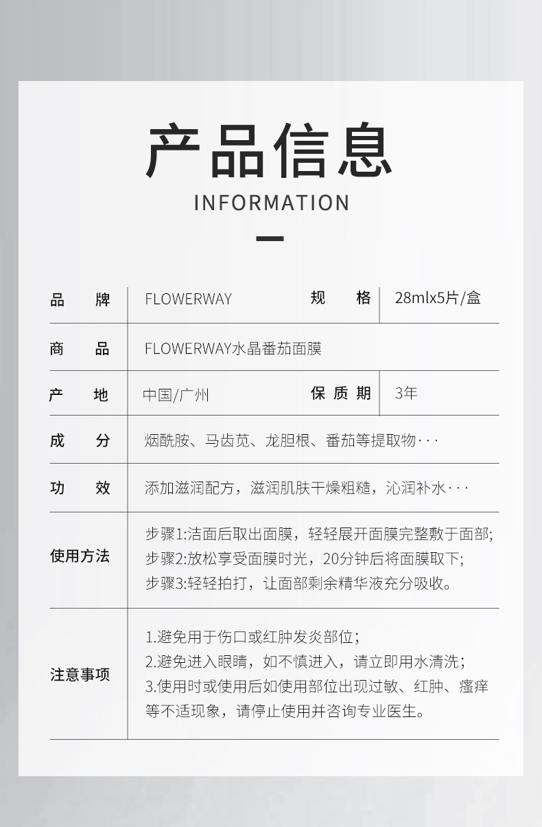 ![]() | Flowerway crystal tomato mask 28ml*5 pieces (boxed) | ¥3.6 / ≈ 44 ₽ | 785370 | 5868302207316 |